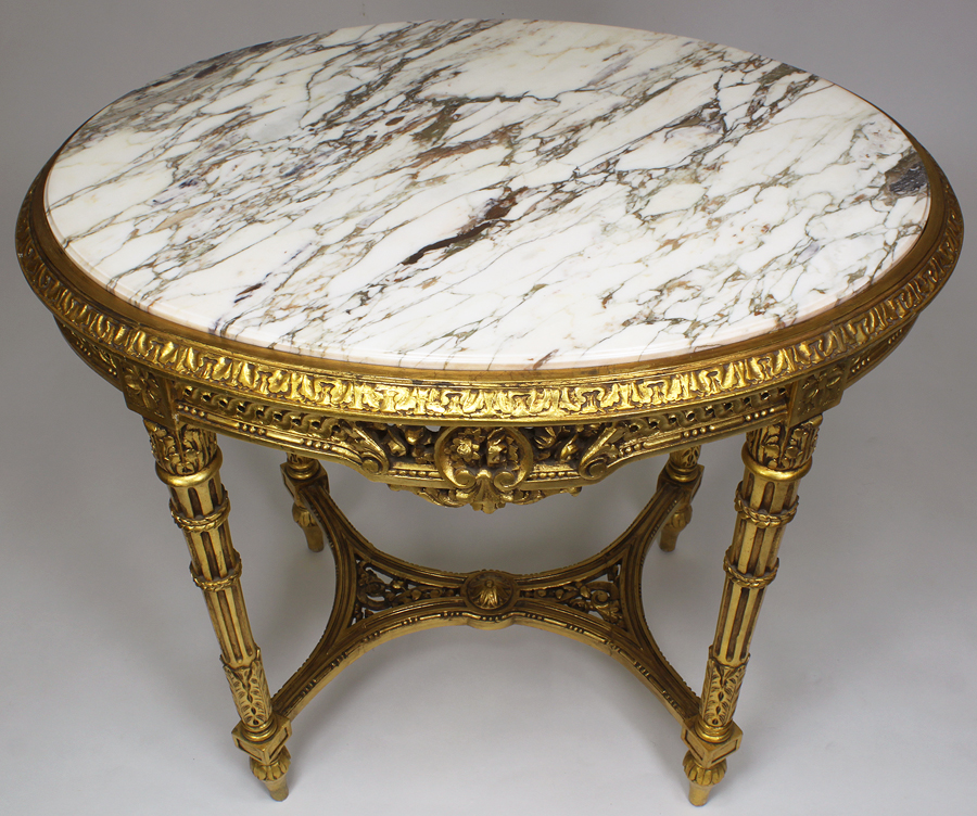 A French Louis XVI Style 'Belle Epoque' Oval Giltwood Carved Center Table with Marble Top. The ornately decorated apron topped with a veined white marble top and raised on four fluted legs conjoined with a "X" carved stretcher. Circa: 1900's.