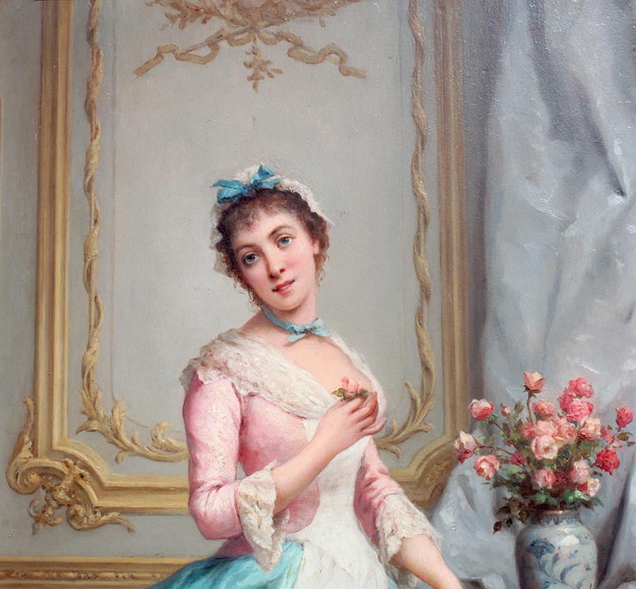 A Very Fine French 19th Century Oil on Board Titled "Summer Roses" by Charles Baptiste Schreiber (French, 1845-1903) depicting an interior Louis XV style room with a standing and posing young maiden holding a rose, her left hand resting on a table with a vase full of roses. Signed: Ch. Schriber (l/r). Circa: Paris: 1890-1900.