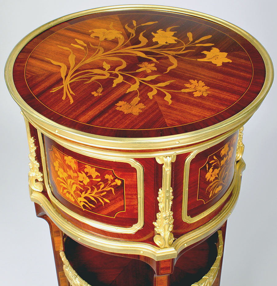 These beautiful tables are after the Work table model, cabinetwork attributed to Jean-Henri Riesener; model designed by Jean-François Oeben, c. 1765 (F313) currently at The Wallace Collection in London, UK. The Wallace describes it with its integrated candle branches and silk-covered shelves for needlework, this little table was the perfect accessory for a wealthy lady’s sitting room in the 18th century. It was made in the workshop of Jean-François Oeben, probably by Riesener when he was a young man.