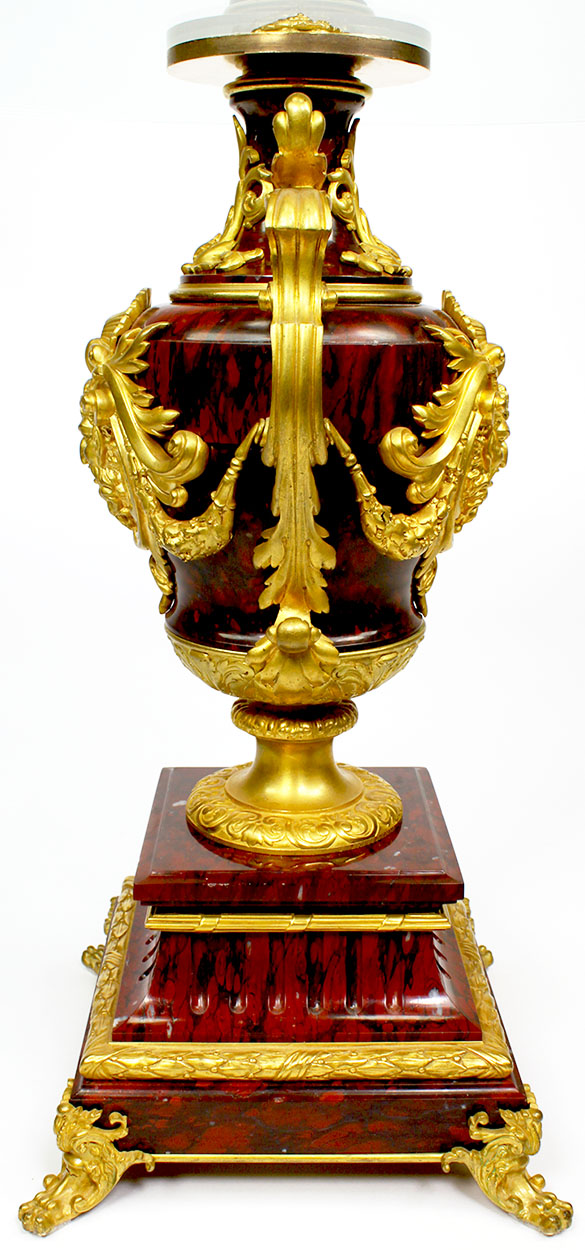 A Fine Pair of French Louis XV Style Ormolu Mounted Rouge Griotte Marble Urns by Ferdinand Barbedienne (French, 1810-1892), now converted to low side tables with glass tops. The ovoid shaped urns surmounted with finely chased allegorical ormolu male masks flanked by foliage and open scrolled handles, all raised on a tapered square marble plinth with ormolu trim and cabriolet feet. The top fitted with a later circular glass top, both urns signed: 'F. Barbedienne'. The urns circa Paris, 1880.