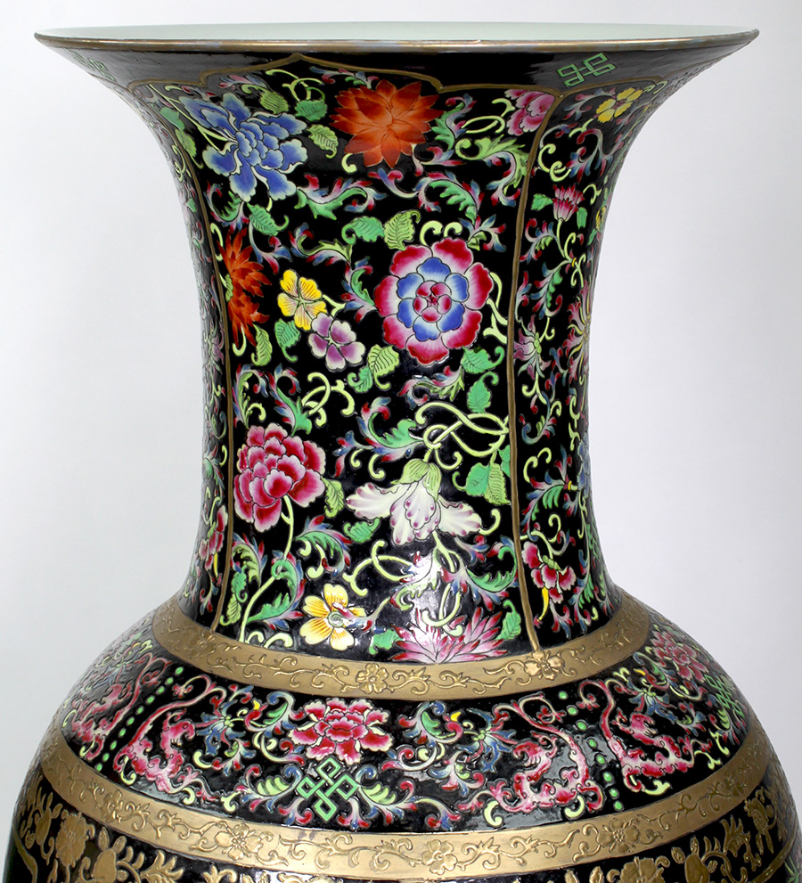 A Pair of Tall Chinese Export Porcelain Figural Vases. The ovoid porcelain bodies decorated with colorful flowers, tropical birds, trees, lilies and a pond, with a parcel-gilt trim and black background. Unsigned-unmarked. Circa: Mid to late 20th century.