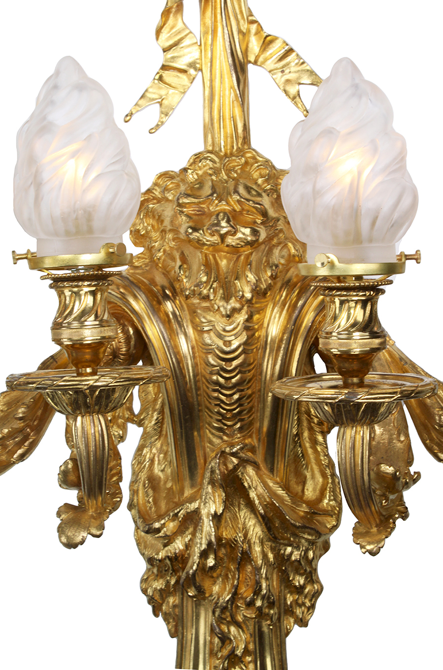 A Very Fine and Impressive Pair of French 19th/20th Century Regénce Style Figural Gilt-Bronze Four-Light Wall Sconces Appliques, each ormolu lumière centered with a lion pelt mask surmounted with four issuing scrolled candle-arm lights fitted with frosted glass flame shades (later), the backplate suspended by a ribbon tied ornament, all ending with floral finials. (Electrified). Circa: Paris, 1870-1880.