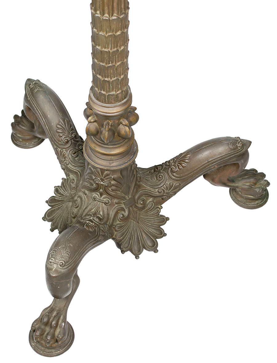 A Rare Tall Pompeiian Style 19th-20th century gilt patinated bronze tripod torchere Floor Lamp fitted with a molded glass shade. The tall fluted center column, topped with decorated ovoid white blown glass shade (later), the tripartite monopodium base with laurel-clasped and acanthus decorations and cabriolet lion-paws raised on tokens, attributed to E.F. Caldwell. Circa: 1890-1900.