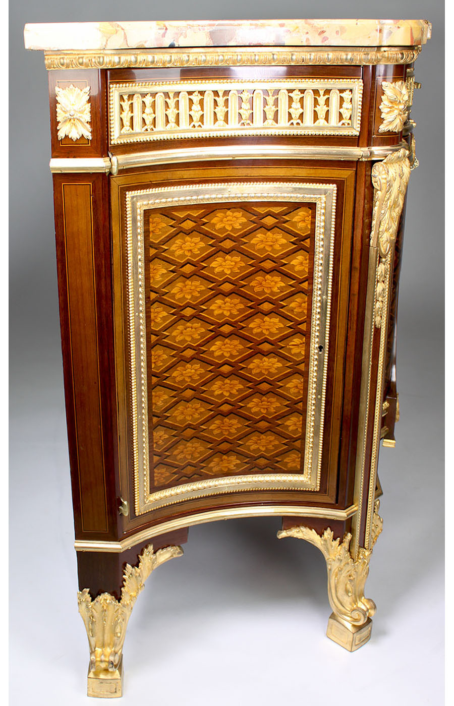 A Very Fine French 19th Century Louis XVI-Louis XVI Transition Style Ormolu-Mounted Mahogany, Birdseye Maple, Fruitwood and Sycamore Marquetry and Parquetry Commode with a Brèche d'Alep Marble-Top, after the model by Jean-Henri Riesener (1734-1806). Circa: 1870-1880. The finely detailed commode with rounded sides, finely chased ormolu mounts with their original mercury gilt, a single center apron drawer with wreath ormolu pulls and an acanthus plate, above a a pair of large drawers centered with a marquetry design depicting an ewer with flowers flanked by a wicker basket filled with fruits, flowers and music instruments tied with ribbons. The serpentine sides doors and lateral panels with an intricate parquetry design and a storage compartment with a single shelf. This Fine commode is also known as the "Fontainebleau Commode" as Riesener's Model of Le Commode du Concordat at Le Château de Fontainebleau. Circa: Paris, 1880-1890.