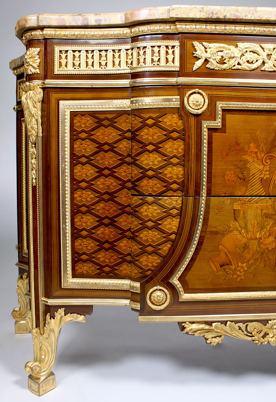 A Very Fine French 19th Century Louis XVI-Louis XVI Transition Style Ormolu-Mounted Mahogany, Birdseye Maple, Fruitwood and Sycamore Marquetry and Parquetry Commode with a Brèche d'Alep Marble-Top, after the model by Jean-Henri Riesener (1734-1806). Circa: 1870-1880. The finely detailed commode with rounded sides, finely chased ormolu mounts with their original mercury gilt, a single center apron drawer with wreath ormolu pulls and an acanthus plate, above a a pair of large drawers centered with a marquetry design depicting an ewer with flowers flanked by a wicker basket filled with fruits, flowers and music instruments tied with ribbons. The serpentine sides doors and lateral panels with an intricate parquetry design and a storage compartment with a single shelf. This Fine commode is also known as the "Fontainebleau Commode" as Riesener's Model of Le Commode du Concordat at Le Château de Fontainebleau. Circa: Paris, 1880-1890.