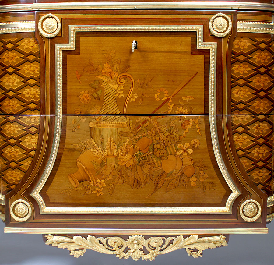 A Very Fine French 19th Century Louis XVI-Louis XVI Transition Style Ormolu-Mounted Mahogany, Birdseye Maple, Fruitwood and Sycamore Marquetry and Parquetry Commode with a Brèche d'Alep Marble-Top, after the model by Jean-Henri Riesener (1734-1806). Circa: 1870-1880. The finely detailed commode with rounded sides, finely chased ormolu mounts with their original mercury gilt, a single center apron drawer with wreath ormolu pulls and an acanthus plate, above a a pair of large drawers centered with a marquetry design depicting an ewer with flowers flanked by a wicker basket filled with fruits, flowers and music instruments tied with ribbons. The serpentine sides doors and lateral panels with an intricate parquetry design and a storage compartment with a single shelf. This Fine commode is also known as the "Fontainebleau Commode" as Riesener's Model of Le Commode du Concordat at Le Château de Fontainebleau. Circa: Paris, 1880-1890.