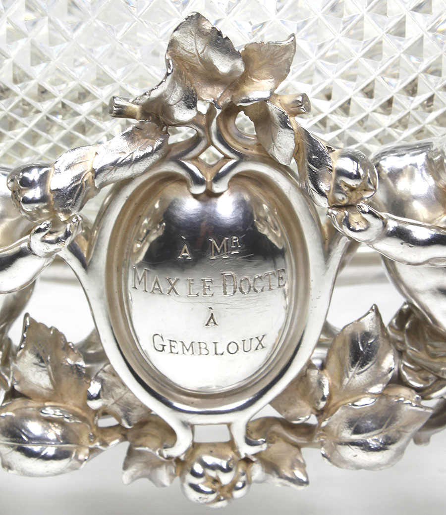 A Very Fine and Palatial French 19th/20th Century Christofle & Cie. Louis XV Style Silvered Figural Centerpiece, fitted with an oval diamond-cut-glass center-dish, attributed to Baccarat, and flanked by two Putti (Children), all on a pomegranate branch-form foot and centered on each side by a pair of putti holding a monogrammed shield, one reads "Temoignage Public D' Estime et de Reconnaissance Ses Concitoyens 1845 ~ 1885" (Public Testimony of Esteem and Recognition his fellow citizens 1845 ~ 1885) and the reverese inscribed "À Mr. Max Le Docte - À, Gembloux". Each handle topped with a Putto holding a bird and nest. The underside stamped: "Christofle - 1175263 V". Circa: Paris, 1900.