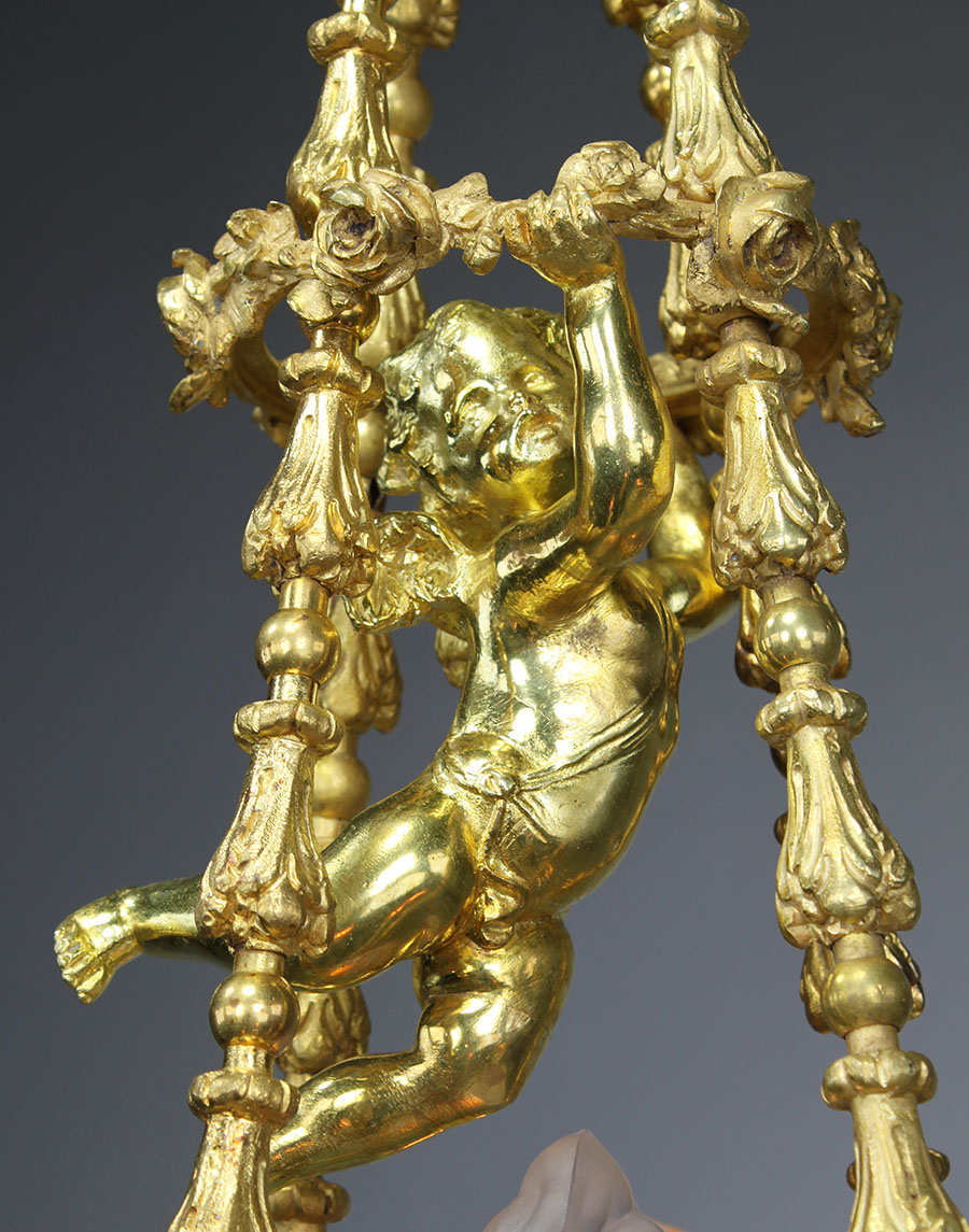 A Fine French 19th Century Louis XV Style Gilt Bronze Seven-Light Figural Chandelier. The elongated and ovoid gilt-bronze frame with six scrolled candle-arms (now electrified ) surmounted with doves, ram-heads, vines, rosettes, fruits and tassels, centered with flambeaux light fitted with a frosted glass flame shade, suspended on tri-tassel-decorated strands centered with an ormolu hovering cherub holding onto a circular floral ring, designed after a model by Pierre Gouthière (1732-1813) . Circa: Paris, 1890-1900.