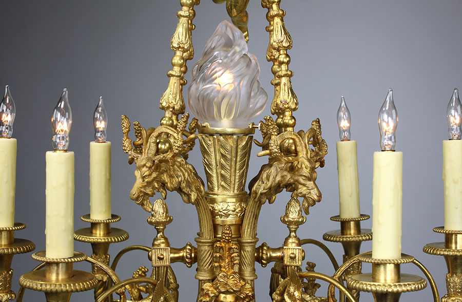 A Fine French 19th Century Louis XV Style Gilt Bronze Seven-Light Figural Chandelier. The elongated and ovoid gilt-bronze frame with six scrolled candle-arms (now electrified ) surmounted with doves, ram-heads, vines, rosettes, fruits and tassels, centered with flambeaux light fitted with a frosted glass flame shade, suspended on tri-tassel-decorated strands centered with an ormolu hovering cherub holding onto a circular floral ring, designed after a model by Pierre Gouthière (1732-1813) . Circa: Paris, 1890-1900.