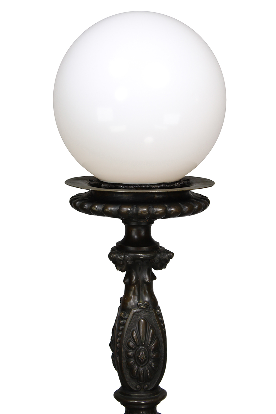 A Large and Impressive Italian 19th Century Patinated Bronze Figural Torchere, after a model by Niccolò Roccatagliata (Genoa 1593 - Venice 1636). The triangular foot base with projecting putti supporting the stem and oval reserves within cartouche motifs, one containing the initials "S.D" with an olive tree in-between and a bull-head below. The stem knot with figures of winged caryatids and festoons and upper part with cherub heads, acanthus leaves and egg and bead patterns and topped with a later white glass globe. The decorative system refers to the documented artistic production of the Venetian workshop of Niccolò Roccatagliata and takes inspirational model from the base of the Renaissance bronze of the Scuola Grande di San Teodoro in Venice, a work signed by Andrea del Bartolomeo di Alessandri known as Brescianino. Electrified. Circa: Venice, 1850-1880.