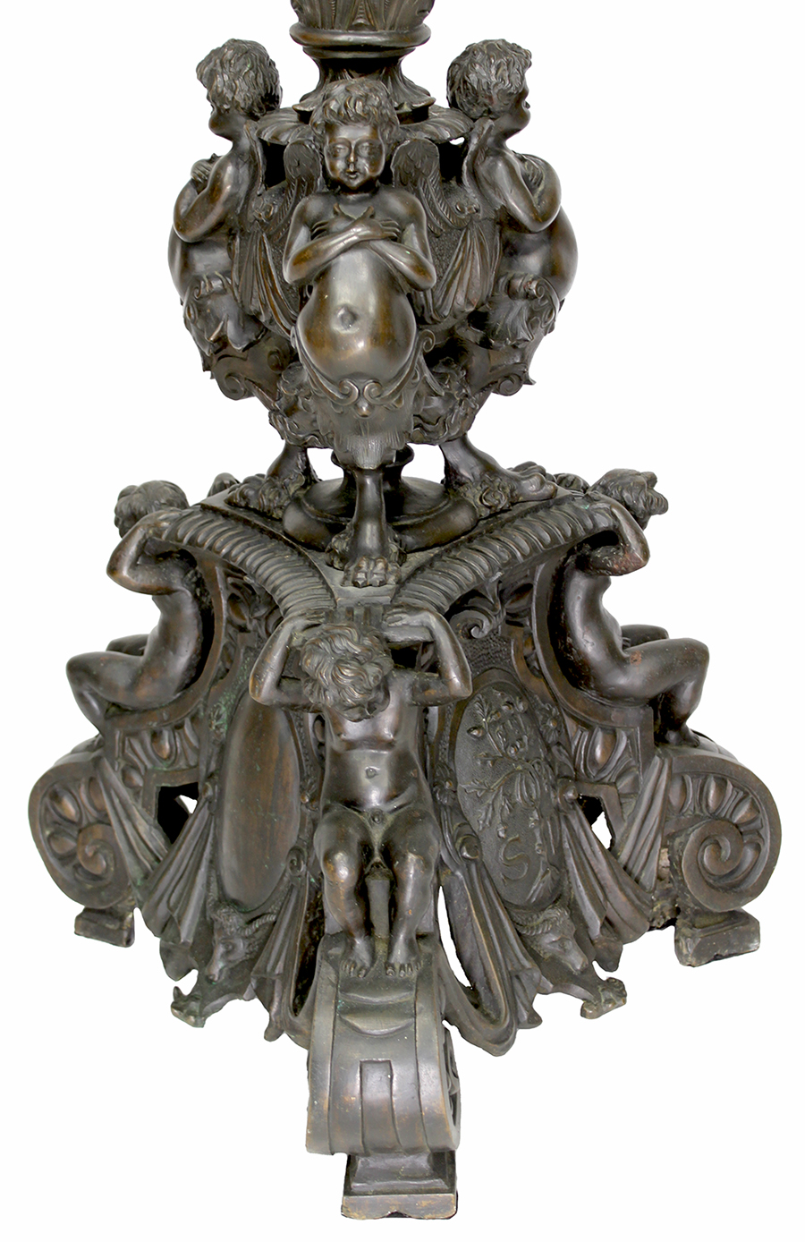 A Large and Impressive Italian 19th Century Patinated Bronze Figural Torchere, after a model by Niccolò Roccatagliata (Genoa 1593 - Venice 1636). The triangular foot base with projecting putti supporting the stem and oval reserves within cartouche motifs, one containing the initials "S.D" with an olive tree in-between and a bull-head below. The stem knot with figures of winged caryatids and festoons and upper part with cherub heads, acanthus leaves and egg and bead patterns and topped with a later white glass globe. The decorative system refers to the documented artistic production of the Venetian workshop of Niccolò Roccatagliata and takes inspirational model from the base of the Renaissance bronze of the Scuola Grande di San Teodoro in Venice, a work signed by Andrea del Bartolomeo di Alessandri known as Brescianino. Electrified. Circa: Venice, 1850-1880.