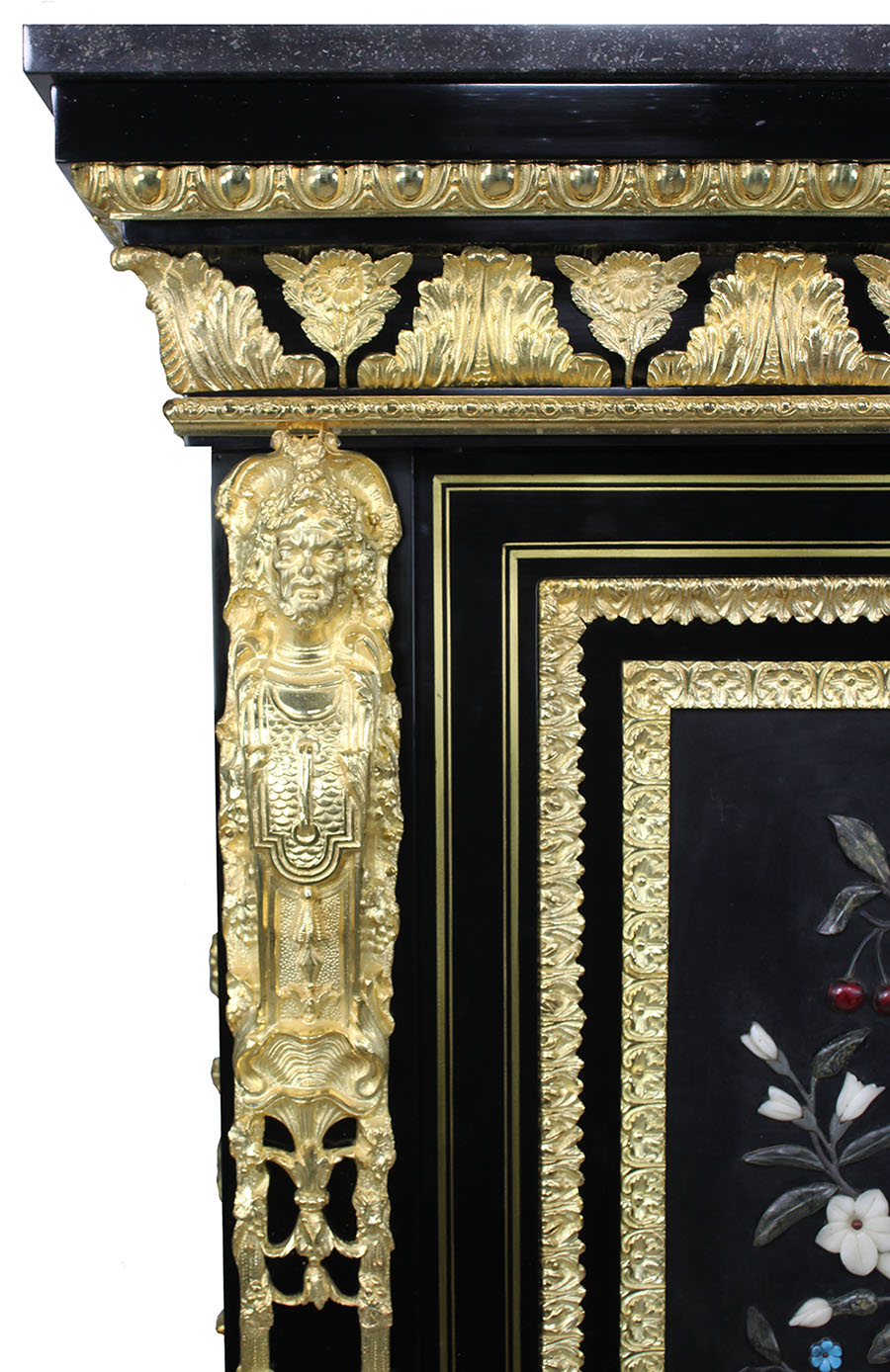 A Very Fine French 19th Century Napoleon III Ormolu Mounted Ebonized Wood and Pietra Dura Meuble d'Appui à Hauteur with a grey marble top. The single front-door black-lacquered cabinet centered with a Pietra Dure (Semi precious hard stones) plaque depicting a floral bouquet, flanked by ormolu mounts of Bacchus, with floral ormolu trims and 'Boulle style' brass inlaid strips; the sides surmounted with ormolu mounts depicting a standing Putto. The base centered with an ormolu female mask flanked by medallions and acanthus. Probably by Befort Frers. Circa: Paris, 1870-1880.