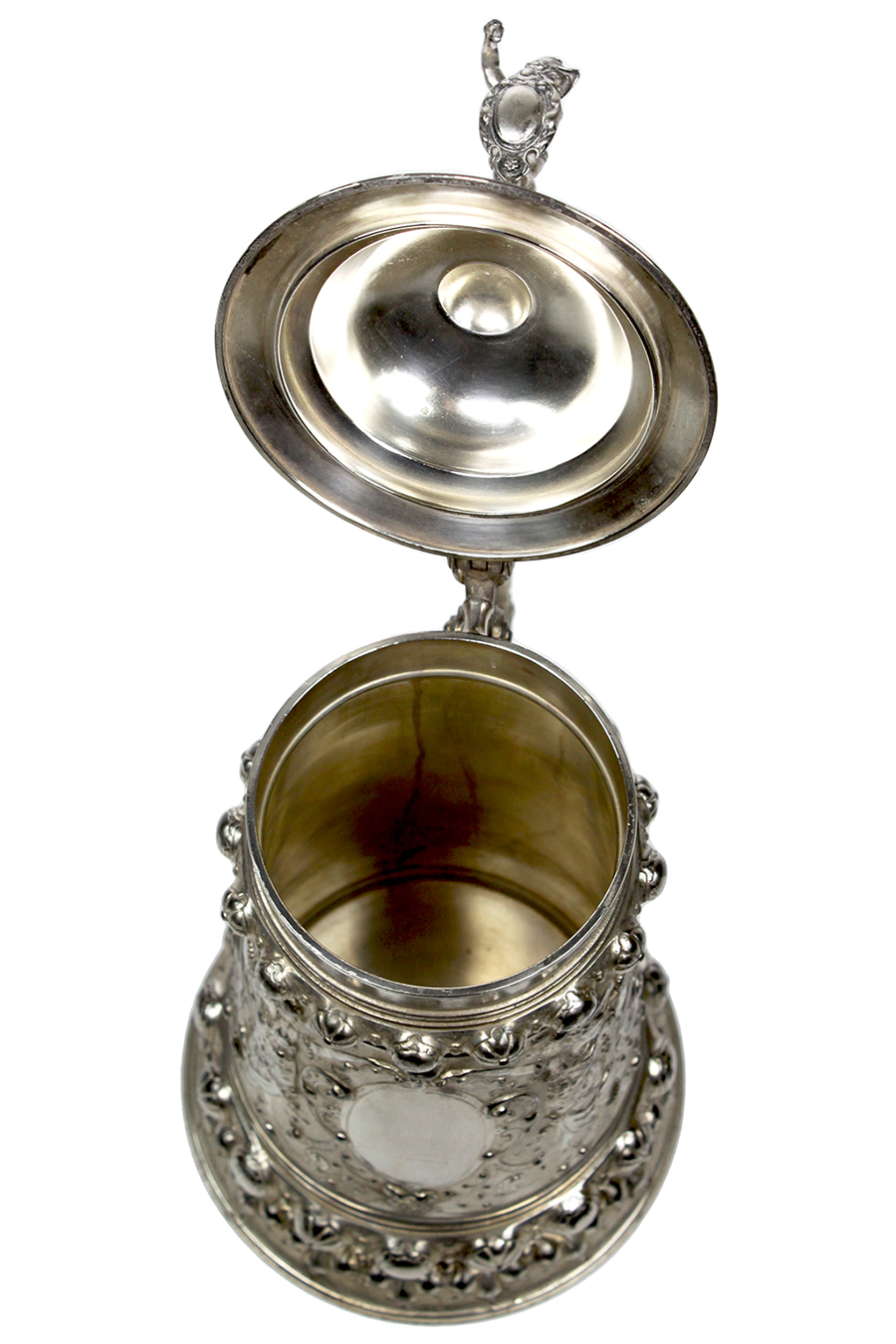 A Fine and Elaborate German 19th Century Renaissance Revival Style Britannia Silver Plated Beer-Tankard by The Württembergische Metallwarenfabrik (WMF). The tall ovoid mug engraved throughout with figures of maidens blowing trumpets, leaves, vines, acanthus, the elaborate designed handle centered with a caryatid of a man, the hinged lid topped with a figure of an armorial Putto wearing a helmet. The base stamped: WMF.B and the number '70'. Circa: 1880.