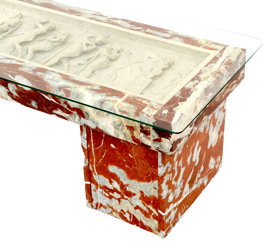 A Very Fine Italian 19th Century Greco-Roman Style Carved Carrara Marble Bas-Relief Frieze, after the antique. The finely carved white marble frieze in relief, depicting a mythological scene of daily life in Ancient Rome in a Roman baths setting; with figures of Pan playing flute to dancing maidens, Roman Gods, children, a plebeian worker and a herm. The frieze has now been framed within a modern rouge Royal marble frame and converted into a twin-pedestal coffee table with a glass top. The frieze circa 1860-1870.