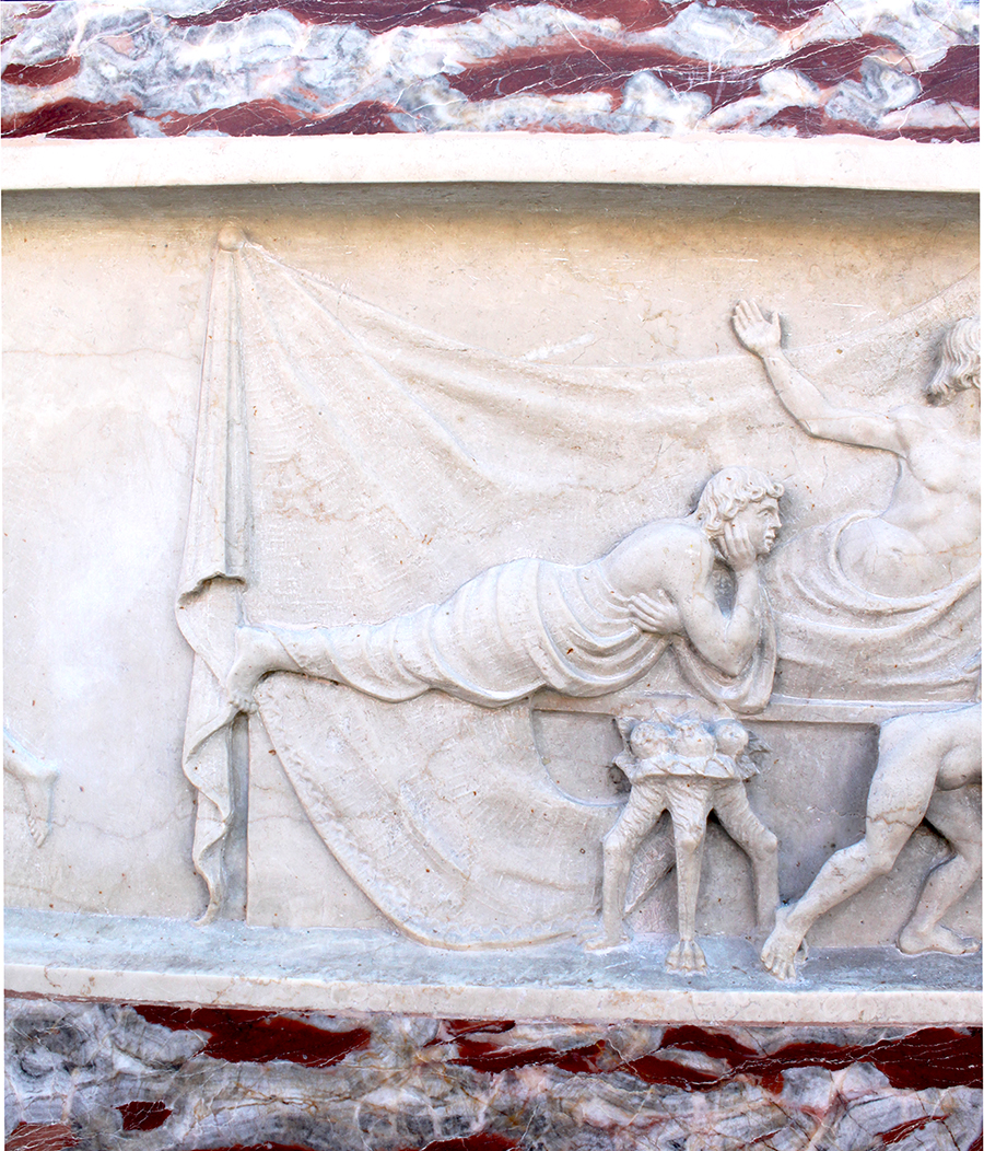 A Very Fine Italian 19th Century Greco-Roman Style Carved Carrara Marble Bas-Relief Frieze, after the antique. The finely carved white marble frieze in relief, depicting a mythological scene of daily life in Ancient Rome in a Roman baths setting; with figures of Pan playing flute to dancing maidens, Roman Gods, children, a plebeian worker and a herm. The frieze has now been framed within a modern rouge Royal marble frame and converted into a twin-pedestal coffee table with a glass top. The frieze circa 1860-1870.