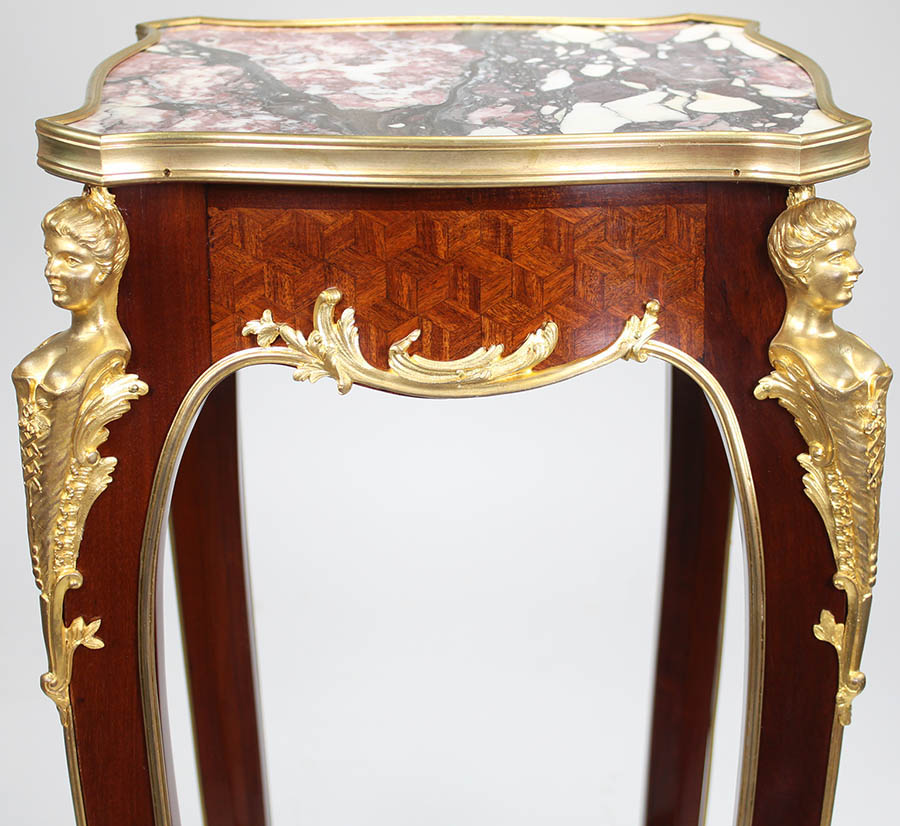 A Fine French 19th-20th Century Louis XV style Mahogany and Gilt-Bronze (Ormolu) Mounted Side Table by François Linke (1855-1946). The square shaped table fitted with a Brêche Violette marble top with a gilt bronze trim, the body surmounted on each corner with bronze caryatid mounts of female busts with laced-tied outfits, with a parquetry apron surmounted with acanthus ormolu mounts and a lower parquetry shelf, all raised on four cabriolet legs ending with gilt bronze sabots. Signed on one mount: F. Linke. Circa: Paris, 1900.