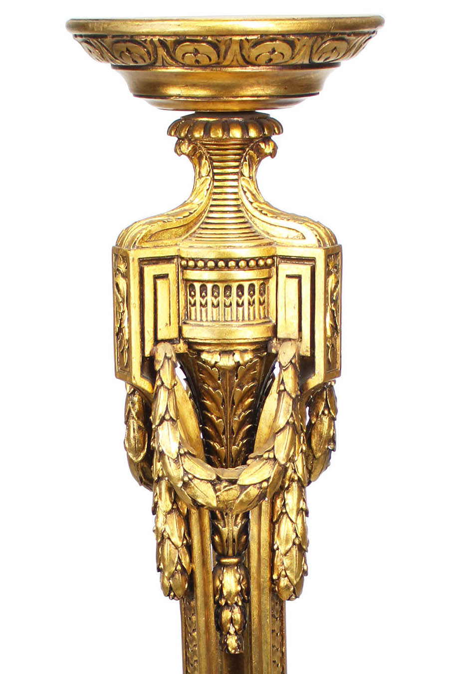 A Pair of French Belle Époque Louis XVI Style Giltwood Carved Torchere (Torchière) Pedestal Stands. The slender tripod body, surmounted with laurel wreaths, rosettes and scrolls, with a circular and scrolled feet. Circa: Paris, 1900-1920.
