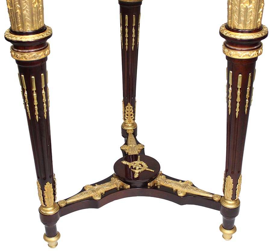 A Fine French Empire-Style Late 19th/Early 20th Century Mahogany and Gilt-Bronze Mounted Planter. This elegant circular planter features a mahogany structure adorned with gilt-bronze mounts. The top is surmounted by allegorical gilt-metal medallions depicting male and female profiles and is framed by a leaf-shaped gallery. The planter is supported by three arrow-shaped legs with acorn finials and spigots, conjoined at the base with Empire-style gilt-bronze mounts. It includes a removable zinc bucket. Circa: Paris, 1890–1900.
