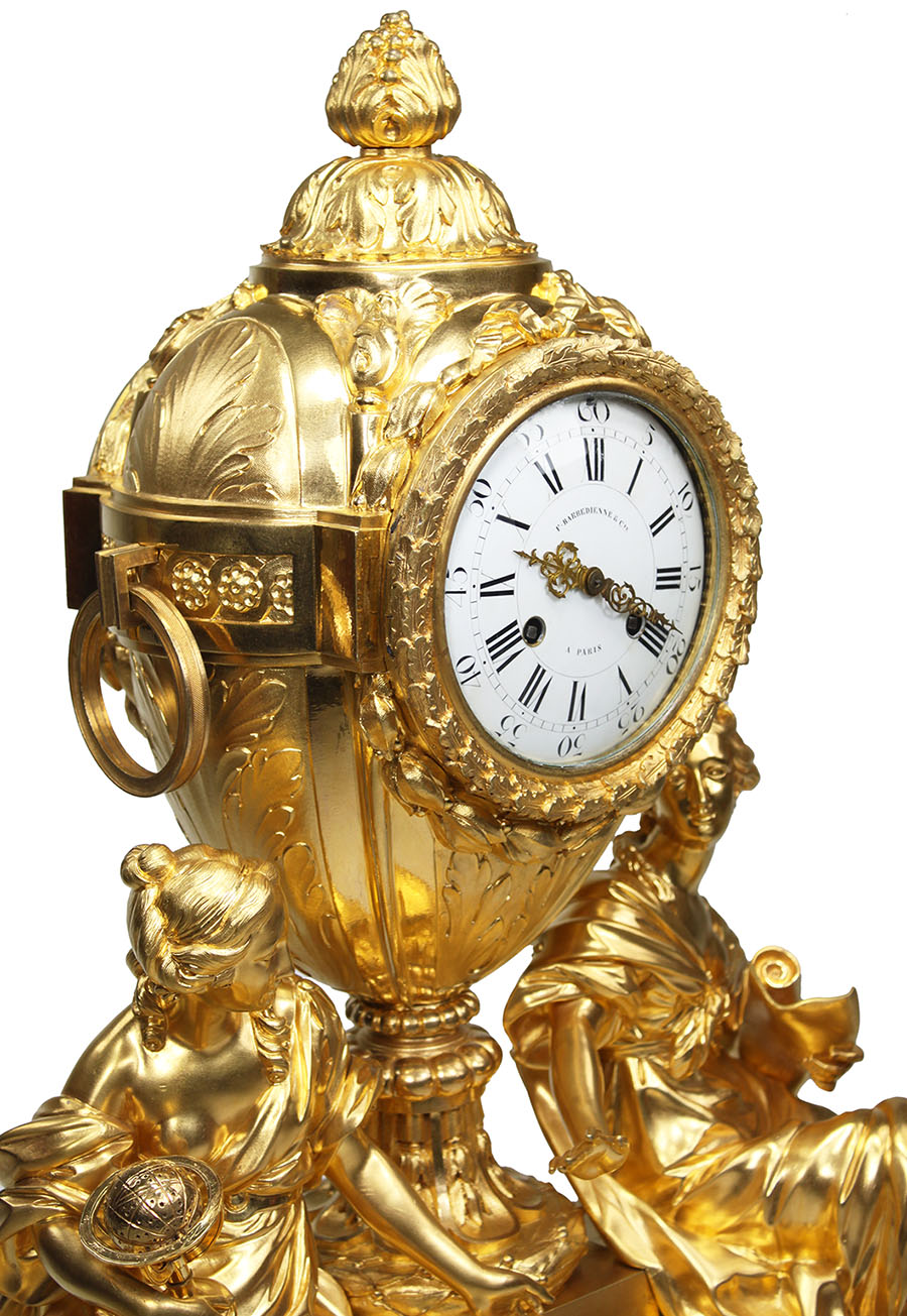 A Very Fine French 19th Century Gilt-Bronze Figural Mantel Clock, Horloge à Poser, by Henri Picard and Fedinand Barbedienne - ‘F. Barbédienne & Cie. / A Paris’, after the model by Étienne Martincourt (French, died after 1791, master 1762). The twin train movement stamped 'Vincenti & Cie - 'Medaille d'Argent' pastille and further inscriptions reading 'AD / 567 & 610'. The impressive finely chased mercury gilt ormolu body surmounted with two muses, a female figure representing Astronomy sits with a celestial globe, while on the right, Geography holds a loosely rolled map, below and ovoid gilt-bronze urn centered with a white enamel clock dial with Roman hours and Arabic minutes and signed 'F. Barbédienne & Cie. / A Paris'. The gilt-bronze base impressed 'H. Picard' twice on the reverse and 'JJ' on several ormolu pieces. Circa: Paris, 1870.