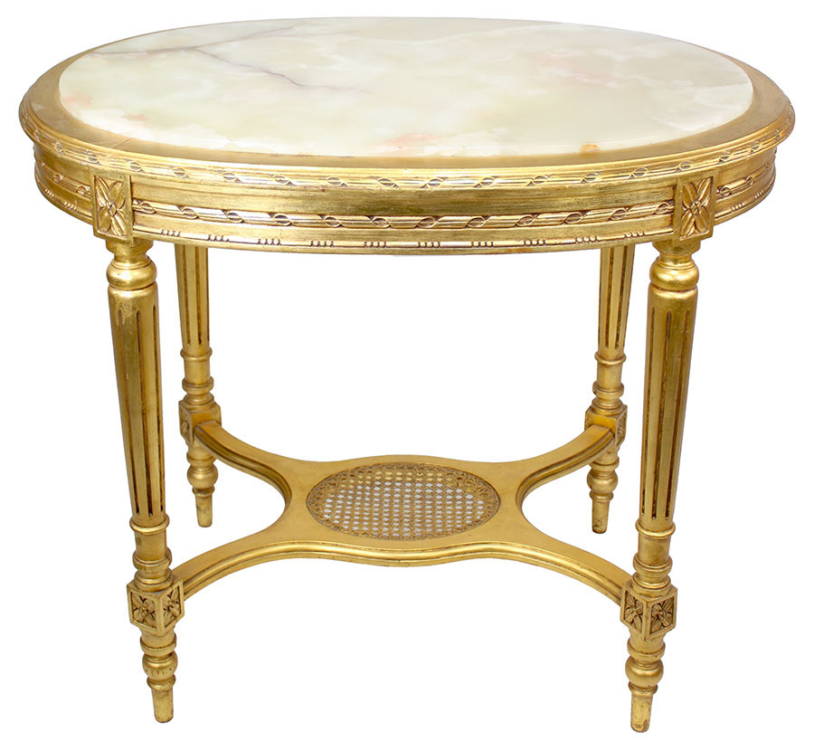 A French Louis XVI Style 'Belle Epoque' Oval Giltwood Carved Center Table with Onyx Top. The decorated carved apron fitted with a veined light-green onyx top and raised on four fluted tapered legs conjoined with a "X" carved stretcher centered with a cane shelf. Circa: 1900's.