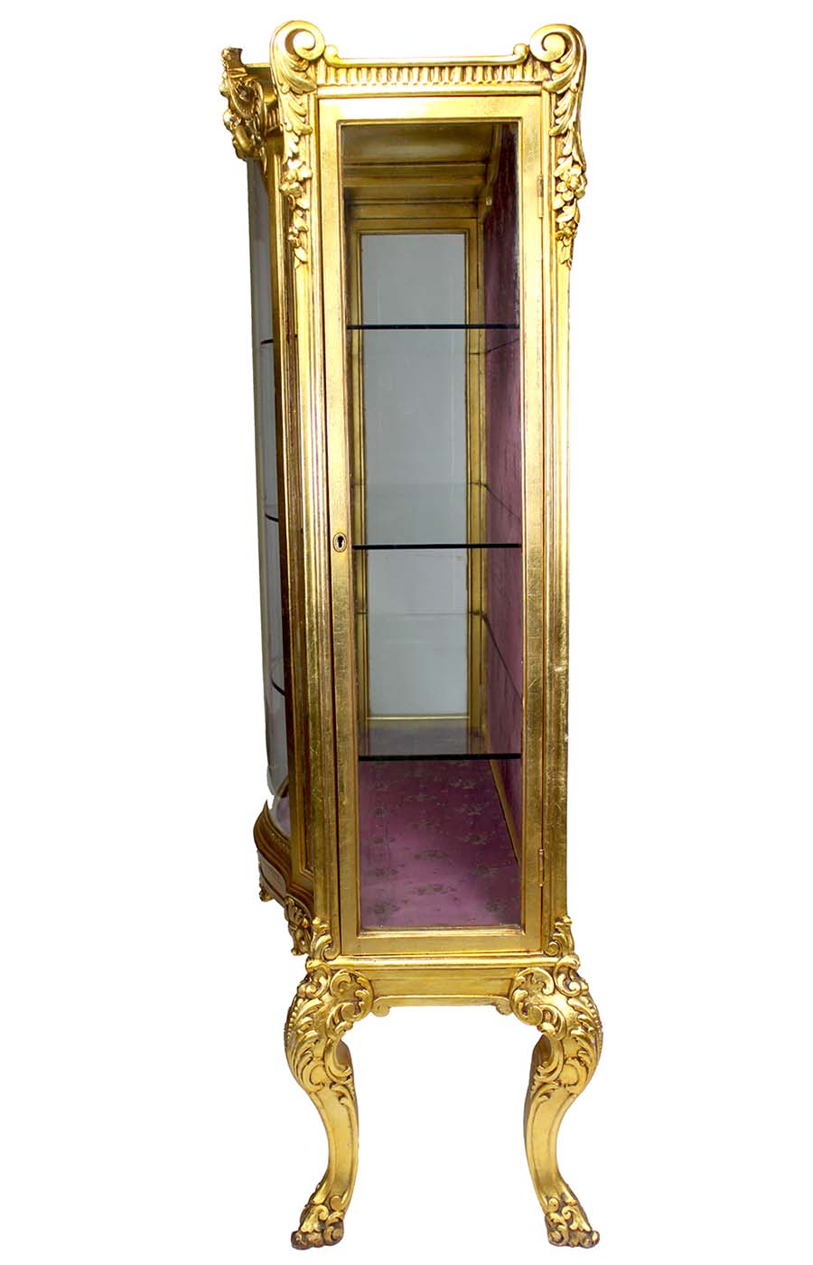 A French Louis XV Style 'Belle Époque' Vitrine Cabinet Giltwood Carved Vitrine. The three panel curio cabinet, the center one with bowed-front glass, with twin side-doors and carved with a floral and scrolled design, raised on four "S" shaped legs, fitted with three interior glass shelves and lined with a burgundy floral fabric. Circa: Paris, 1920's.