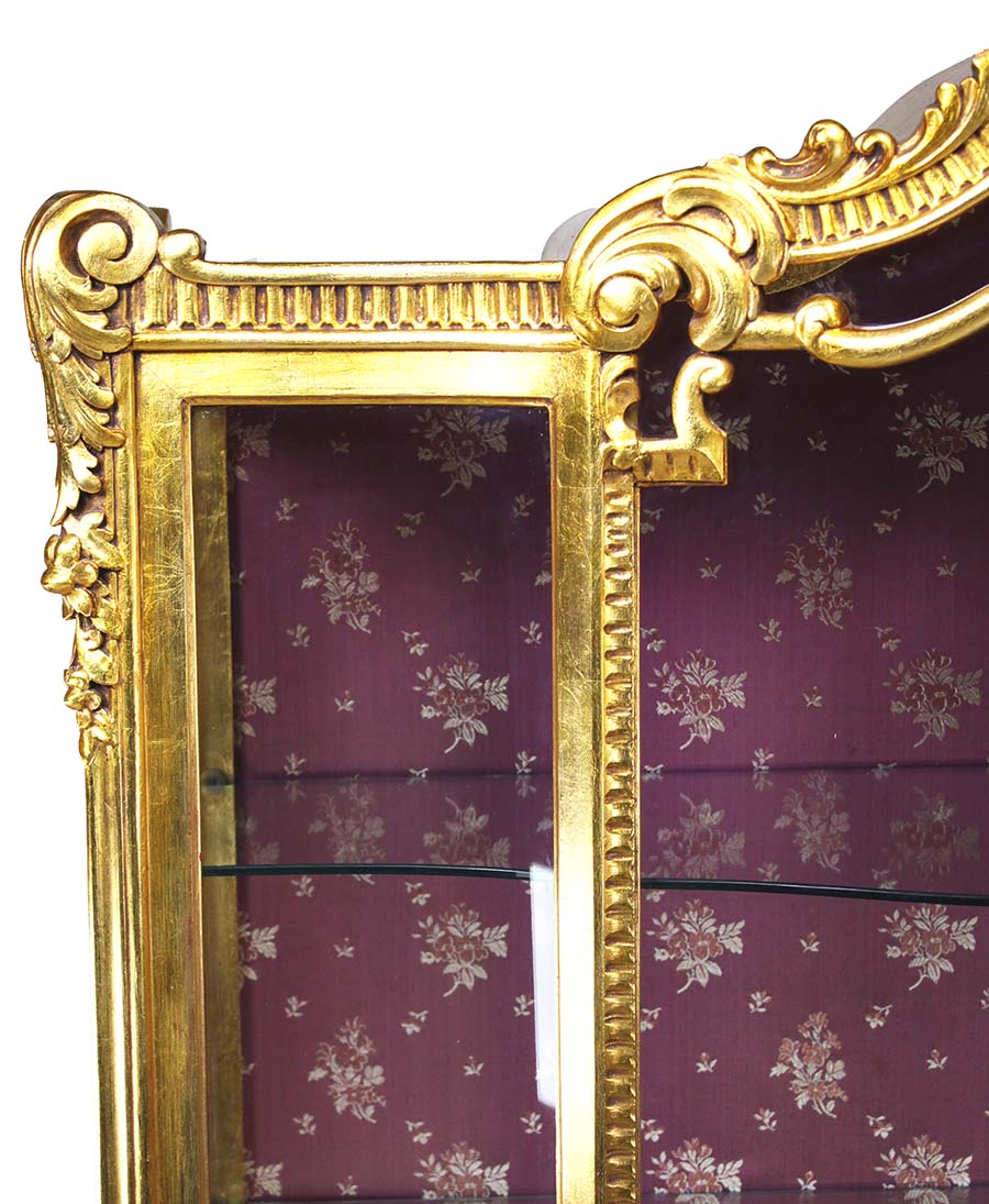 A French Louis XV Style 'Belle Époque' Vitrine Cabinet Giltwood Carved Vitrine. The three panel curio cabinet, the center one with bowed-front glass, with twin side-doors and carved with a floral and scrolled design, raised on four "S" shaped legs, fitted with three interior glass shelves and lined with a burgundy floral fabric. Circa: Paris, 1920's.