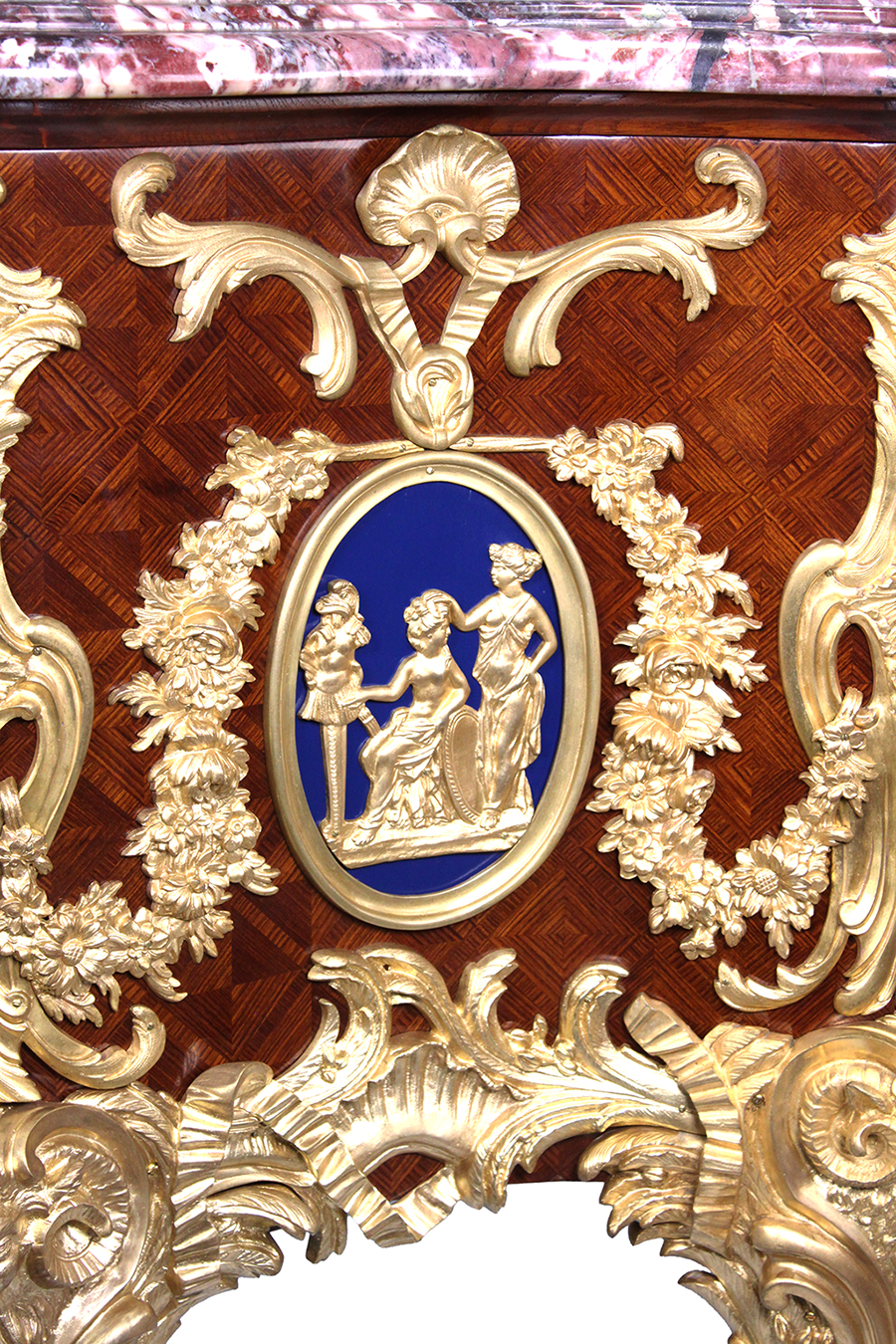 A Fine and Impressive French 19th Century Louis XV Style Ormolu-Mounted Mahogany and Parquetry Commode a Vantaux, after the model Antoine Gaudreaux's 'Commode Médallier du Roi Louis XV'. The ornate ormolu mounted serpentine body with a moulded shaped marble top above a pair of doors opening to four drawers, the front applied within a foliate and ribbon-tied acanthus leaves and flower garlands, the medals cast with Roman Emperors and centered by ovals with a cherub and goat and Ariadne on a leopard on a Royal Bleu background, all on a diamond parquetry ground centered by a female mask, the shaped sides with similar mouldings, centered by Hercules and Venus with Athena on moulded scroll legs, each headed with ram's head mounts. Circa: Paris, 1880.