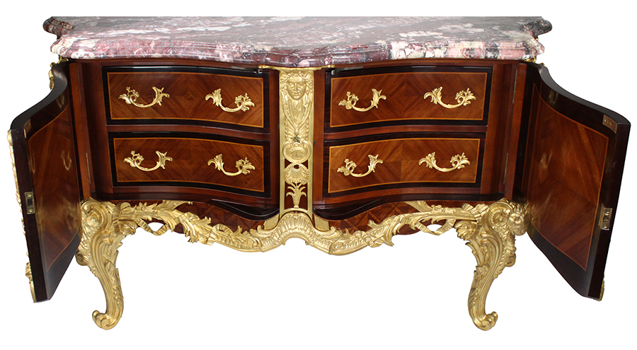 The commode veneered with kingwood and satiné that he delivered for the King's Bedchamber at Versailles in 1739. It has gilt-bronze mounts by Jacques Caffieri, stamped FAIT PAR CAFFIERI. The commode is now in the Wallace Collection, London (Cat.no. F86).
