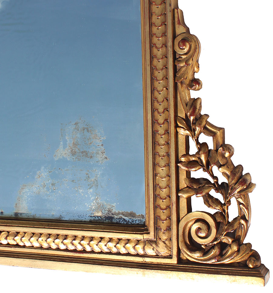 A French Belle Époque Louis XV Style Gilt-Wood Carved Trumeau Mirror. The Rectangular shaped frame crowned with a circular oil on panel painting depicting a young boy sitting on a field holding a fishing pole, the painting surmounted with an ornate gilt-wood carved frame with floral swags and garland, below a floral basket with fruits and ribbons, the rectangular mirror plate (with silver losses) flanked on the bottom by scrolled gilt-wood carved floral decorations. Circa: Paris, 1900-1920.