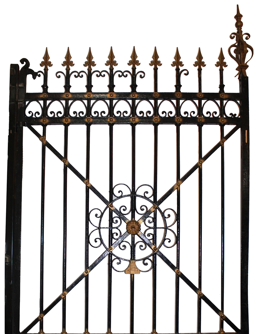 A Palatial Pair of French 19th Century Louis XV Style Wrought Iron Driveway Entrance Gates. The tall and heavy iron gates centered with an with an ornate circular and scrolled design with Fleur-de-lis decorations and arrowheads, the left gate topped with an iron Spire. Circa: 1890-1900.