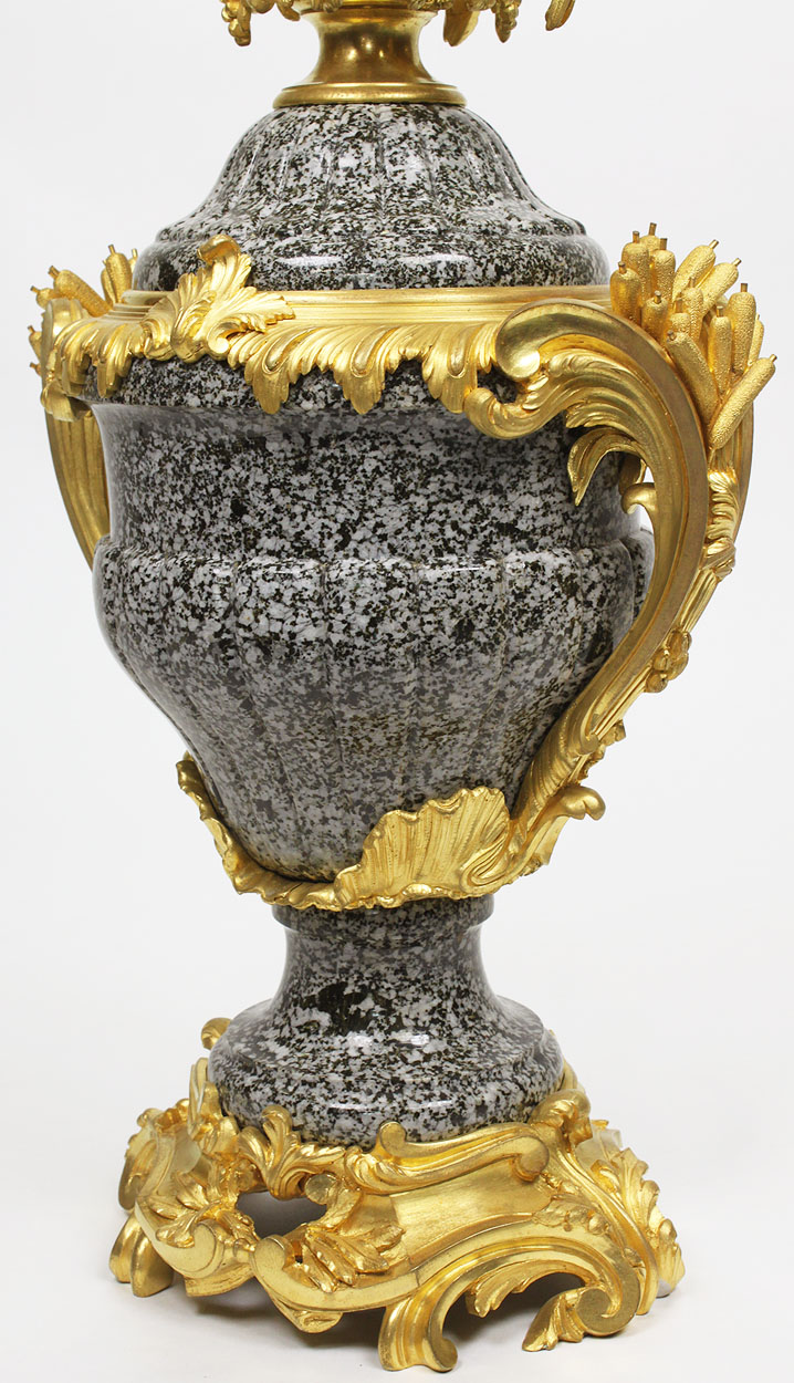 A Very Fine French 19th/20th Century Louis XV Style Three-Piece Garniture Set of Ormolu-Mounted Mottled Granite-Marble Urn Seven-Light Candelabras, attributed to François Linke (1855-1946). The tapering ovoid bodies applied with a pair of scrolled handles cast with acanthus-sheathed bulrushes, on a spreading foot and square plinth with acanthus clasps, topped with an ornate scrolled candle-arms, each with a floral design protruding from a clasp of cast-fruits. (Unsigned). Circa: Paris, 1890-1890.