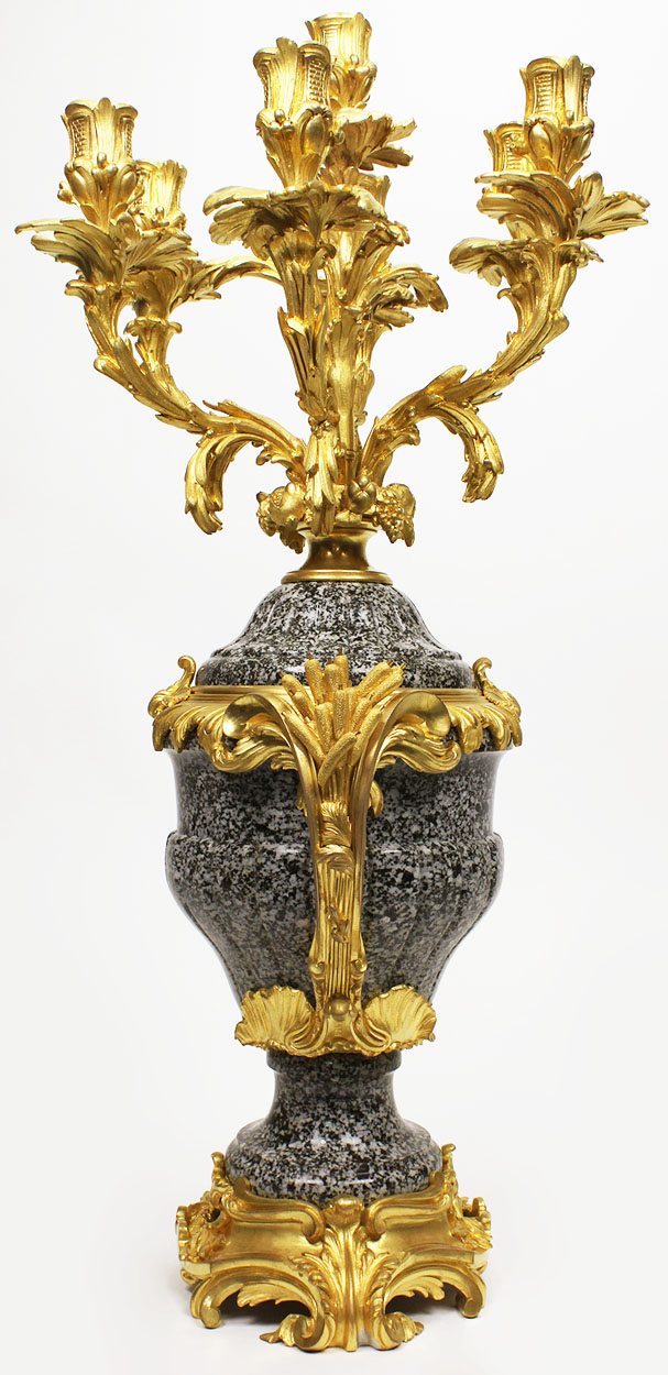A Very Fine French 19th/20th Century Louis XV Style Three-Piece Garniture Set of Ormolu-Mounted Mottled Granite-Marble Urn Seven-Light Candelabras, attributed to François Linke (1855-1946) . The tapering ovoid bodies applied with a pair of scrolled handles cast with acanthus-sheathed bulrushes, on a spreading foot and square plinth with acanthus clasps, topped with an ornate scrolled candle-arms, each with a floral design protruding from a clasp of cast-fruits. (Unsigned ). Circa: Paris, 1890-1890.