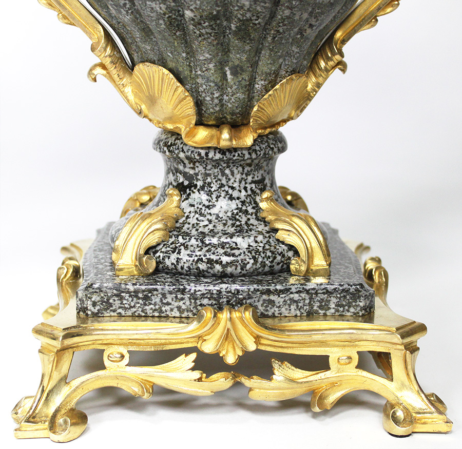 A Very Fine French 19th/20th Century Louis XV Style Three-Piece Garniture Set of Ormolu-Mounted Mottled Granite-Marble Urn Seven-Light Candelabras, attributed to François Linke (1855-1946). The tapering ovoid bodies applied with a pair of scrolled handles cast with acanthus-sheathed bulrushes, on a spreading foot and square plinth with acanthus clasps, topped with an ornate scrolled candle-arms, each with a floral design protruding from a clasp of cast-fruits. (Unsigned). Circa: Paris, 1890-1890.