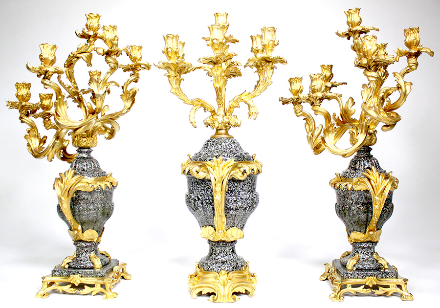 A Very Fine French 19th/20th Century Louis XV Style Three-Piece Garniture Set of Ormolu-Mounted Mottled Granite-Marble Urn Seven-Light Candelabras, attributed to François Linke (1855-1946) . The tapering ovoid bodies applied with a pair of scrolled handles cast with acanthus-sheathed bulrushes, on a spreading foot and square plinth with acanthus clasps, topped with an ornate scrolled candle-arms, each with a floral design protruding from a clasp of cast-fruits. (Unsigned ). Circa: Paris, 1890-1890.