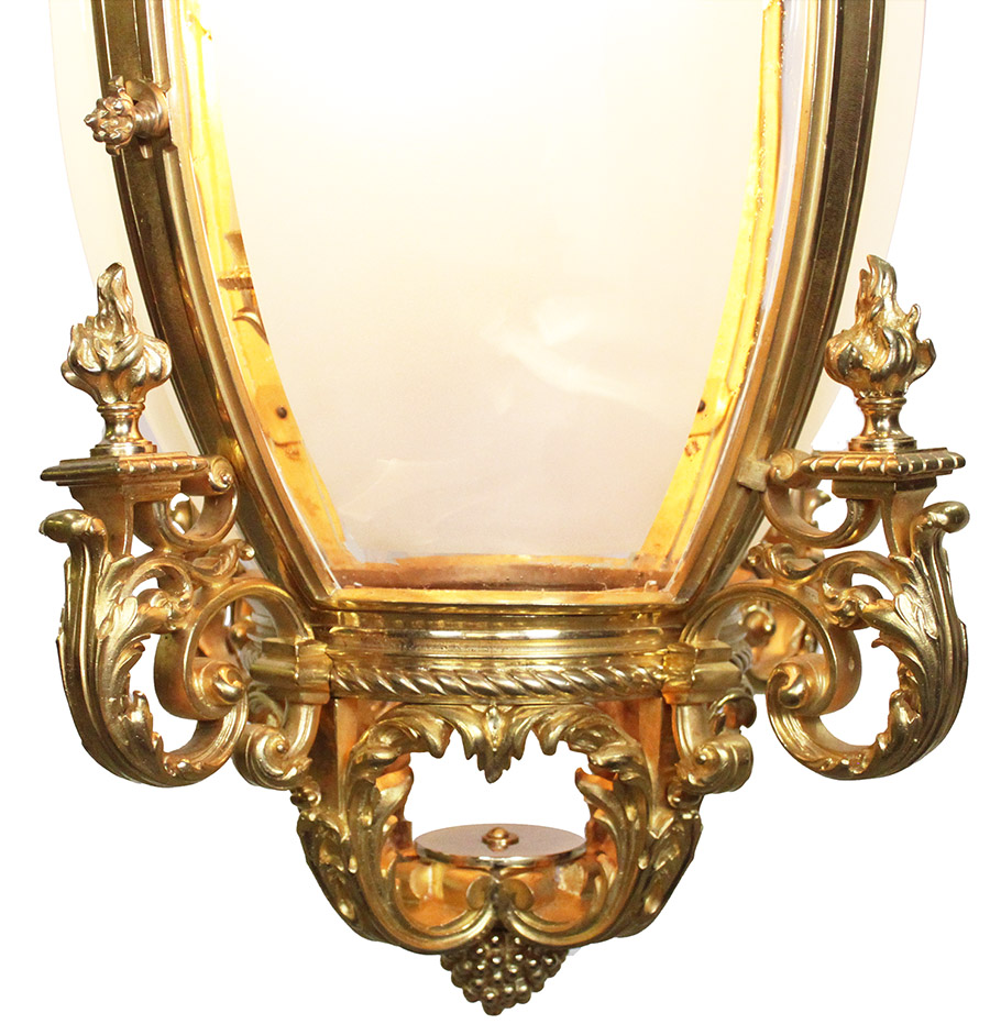A Very Fine and Palatial Pair of French 19th/20th Century Régence Style Ormolu Four-Light Lanterns. The impressive pair of lanterns with a pierced circular strapwork corona above a lion-mask handle, surmounting a pierced dome above lambrequins, centered by a branch issuing for nozzles, within a bowl-shaped cage, headed by a pierced scrolling foliate frieze, flanked by four standing warriors, each above a grotesque mask, with a scrolling foliate lower terminal, headed by four flame finials. The interior with a suspending four-light candelabrum. All original mercury gilt. Circa: Paris, 1900.