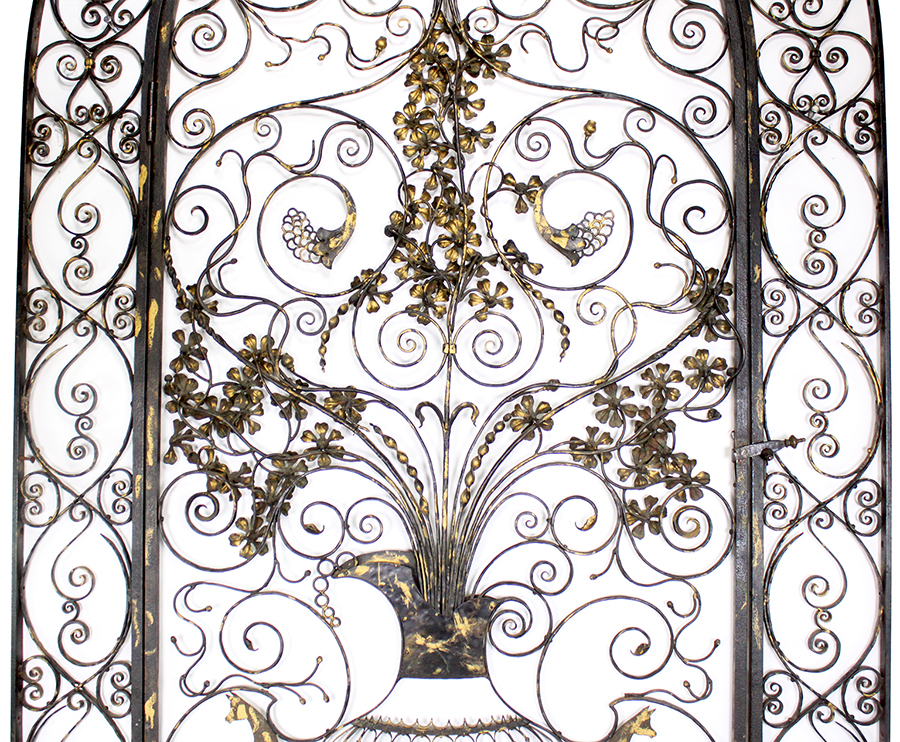 A Fine and Rare Ornate 20th Century Wrought Iron and Parcel-Gilt Figural Entry or Wine-Cellar Gate in the manner of Edgar Brandt (French, 1880–1960). The intricately designed Art Deco-style single-door domed frame features scrolled ornamentation, surmounted by a vase with floral branches and grape clusters, and flanked by a pair of parcel-gilt leaping gazelles. Circa: Likely French, Mid-20th Century.