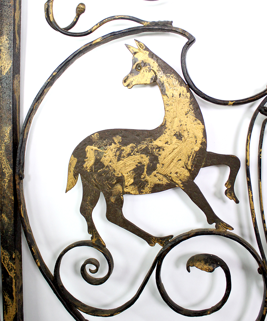 A Fine and Rare Ornate 20th Century Wrought Iron and Parcel-Gilt Figural Entry or Wine-Cellar Gate in the manner of Edgar Brandt (French, 1880–1960). The intricately designed Art Deco-style single-door domed frame features scrolled ornamentation, surmounted by a vase with floral branches and grape clusters, and flanked by a pair of parcel-gilt leaping gazelles. Circa: Likely French, Mid-20th Century.