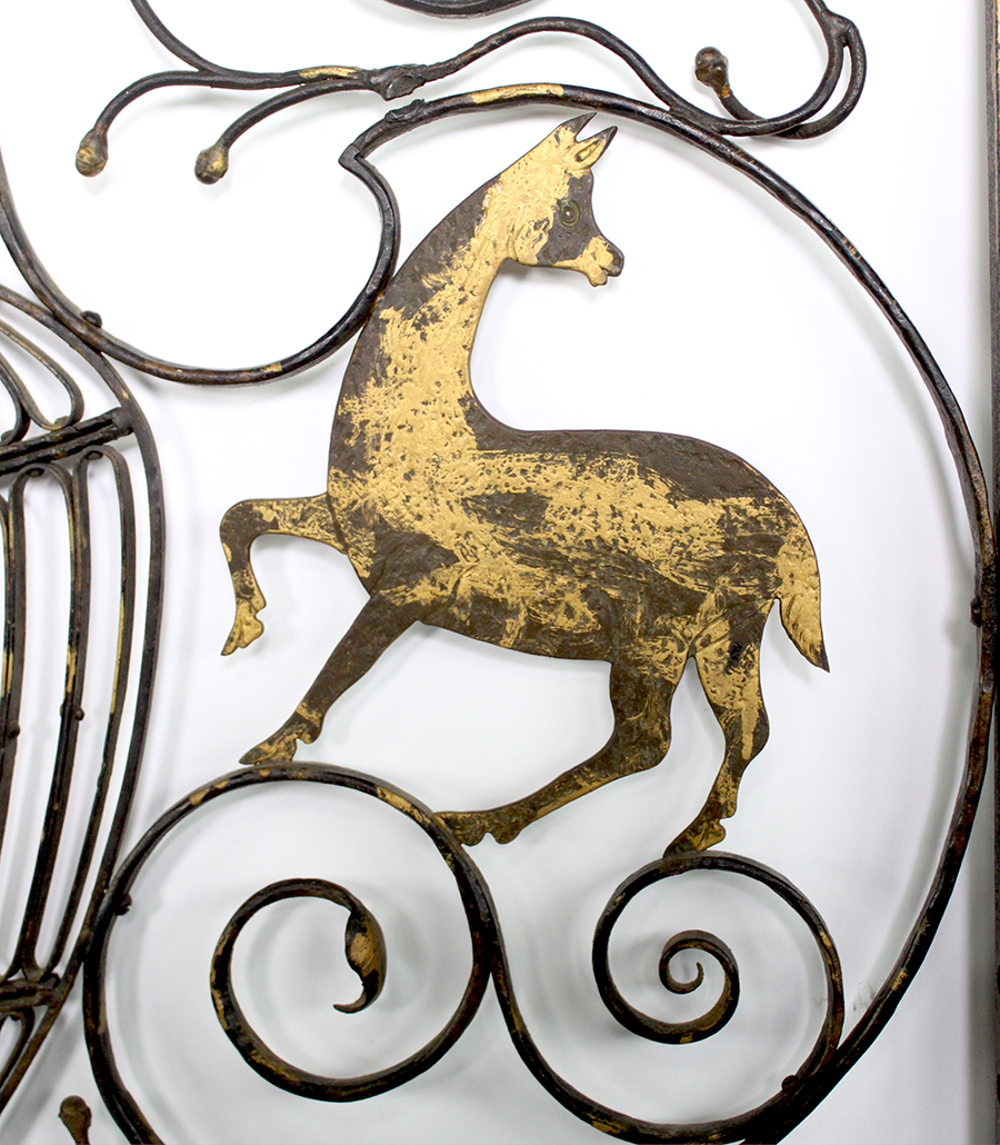 A Fine and Rare Ornate 20th Century Wrought Iron and Parcel-Gilt Figural Entry or Wine-Cellar Gate in the manner of Edgar Brandt (French, 1880–1960). The intricately designed Art Deco-style single-door domed frame features scrolled ornamentation, surmounted by a vase with floral branches and grape clusters, and flanked by a pair of parcel-gilt leaping gazelles. Circa: Likely French, Mid-20th Century.