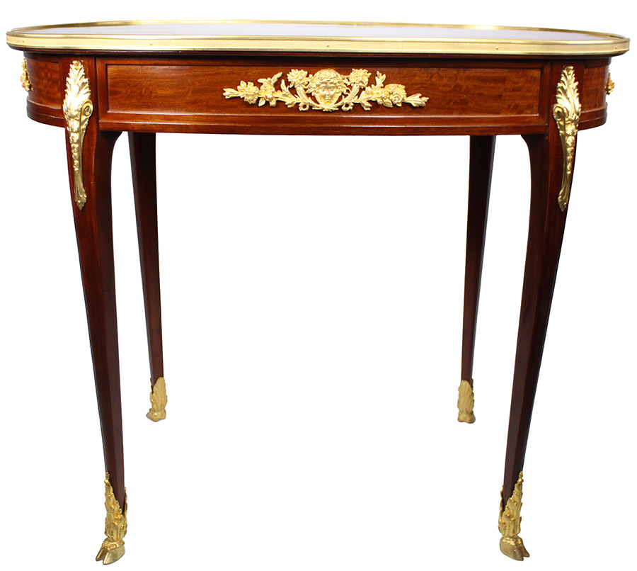 A Fine French 19th-20th Century Louis XV-Style Mahogany, Tulipwood, Parquetry and Ormolu-Mounted Oval Guéridon - Side-Table, attributed to François Linke (1855–1946). The oval top veneered in diamond-patterned cube parquetry within a tulipwood crossbanded and moulded ormolu border, above a conforming frieze fitted with a single drawer. The frieze applied on all four sides with exceptional chased and gilt-bronze mounts centred by a female mask framed by scrolling acanthus, roses, and fruiting foliage, the apron edged with beading and reeding. Raised on elegant cabriole legs headed by floral espagnolette corner mounts and terminating in hoof sabots. Unsigned. Circa: Paris, 1900.