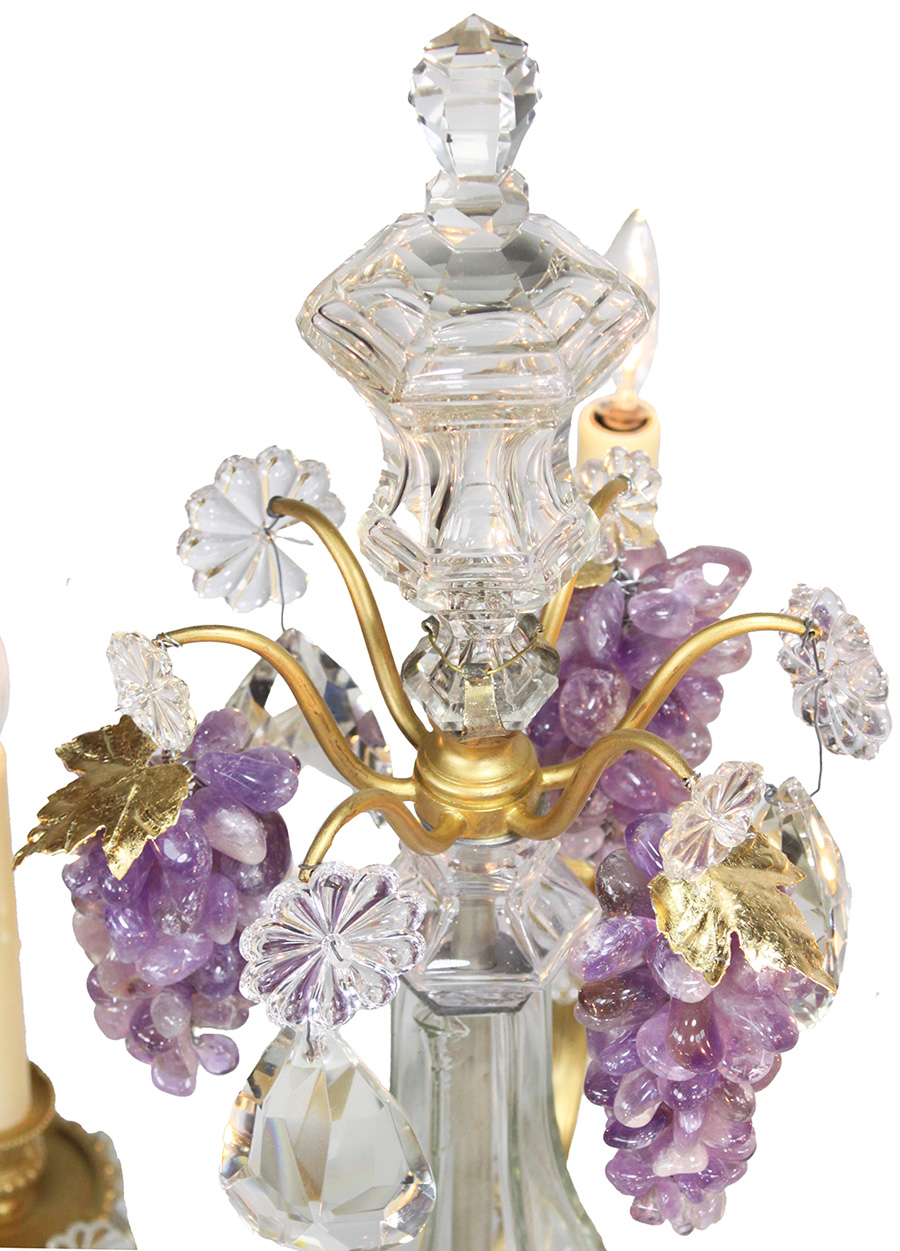 A Very Fine Pair of French 19th Century Louis XV Style Gilt-Bronze and Cut-Glass Six-Light Girandoles Table lamps, in the manner of Baccarat. The finely chased ormolu frame with six scrolled candle-arms, each with scrolled acorn decorations and surmounted with cut-glass pendants, the center with a glass stem crowned with a cut-glass finial surmounted with amethyst grape clusters, all raised on a scrolled tripod acanthus ormolu base. (Electrified). Circa: Paris, 1890-1900.