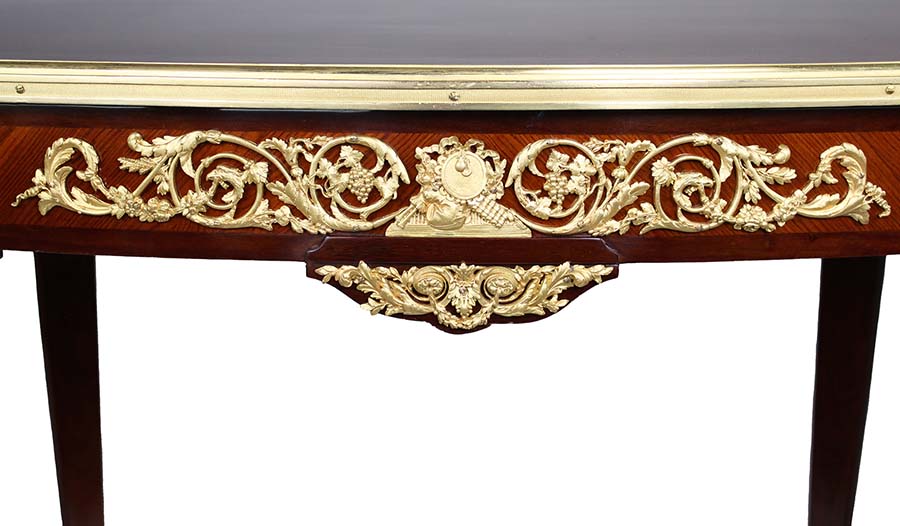 A Very Fine French 19th/20th Century Louis XV Style Oval Gilt-Bronze Mounted Mahogany and Satinwood Veneered Parquetry Occasional Center Table, fitted with a frieze drawer, attributed to François Linke (1855-1946). The top with a diamond-shaped parquetry design within a banded gilt-bronze rim, the frieze surmounted with ormolu musical instruments, acanthus and vines, each leg with ram-heads mound and gilt-bronze sabots. (Unsigned - unmarked). Circa: Paris, 1900-1910.