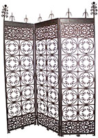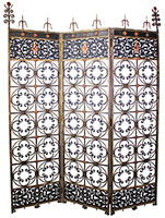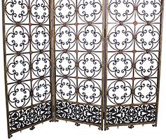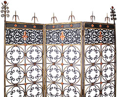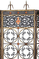 A Charming Ornate French Baroque Revival Style Three-Panel Wrought Iron and Metal Room-Divider Screen. The slender pierced screen with scrolled metalwork, floral rosettes, fleur-de-lis, spear-heads and an acanthus design, finished in a black, rouge-Royal and parcel-gilt. Circa: First quarter 20th Century.