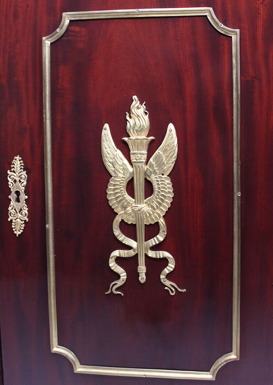A Fine and Rare French Napoleon III Empire Style Mahogany and Gilt-Bronze Mounted Knee-Hole Secretaire with a Pull-Drawer Desk and Three Upper-Drawers with Two-Side Door Compartments, the body surmounted with gilt-bronze decorations allegorical to the First Empire. Note: Stamped JACOB on the carcass underneath. Circa: 1870.