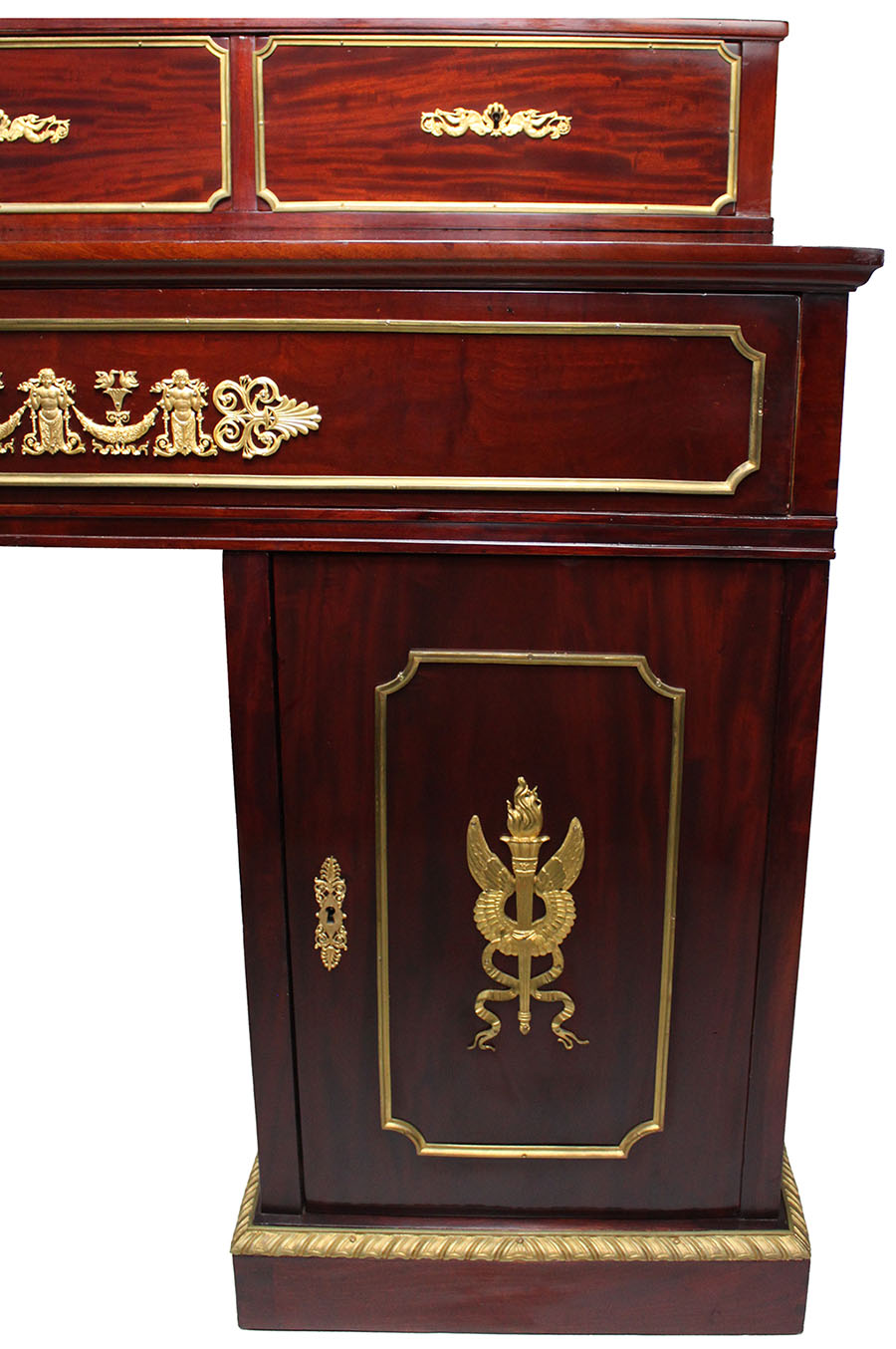 A Fine and Rare French Napoleon III Empire Style Mahogany and Gilt-Bronze Mounted Knee-Hole Secretaire with a Pull-Drawer Desk and Three Upper-Drawers with Two-Side Door Compartments, the body surmounted with gilt-bronze decorations allegorical to the First Empire. Note: Stamped JACOB on the carcass underneath. Circa: 1870.