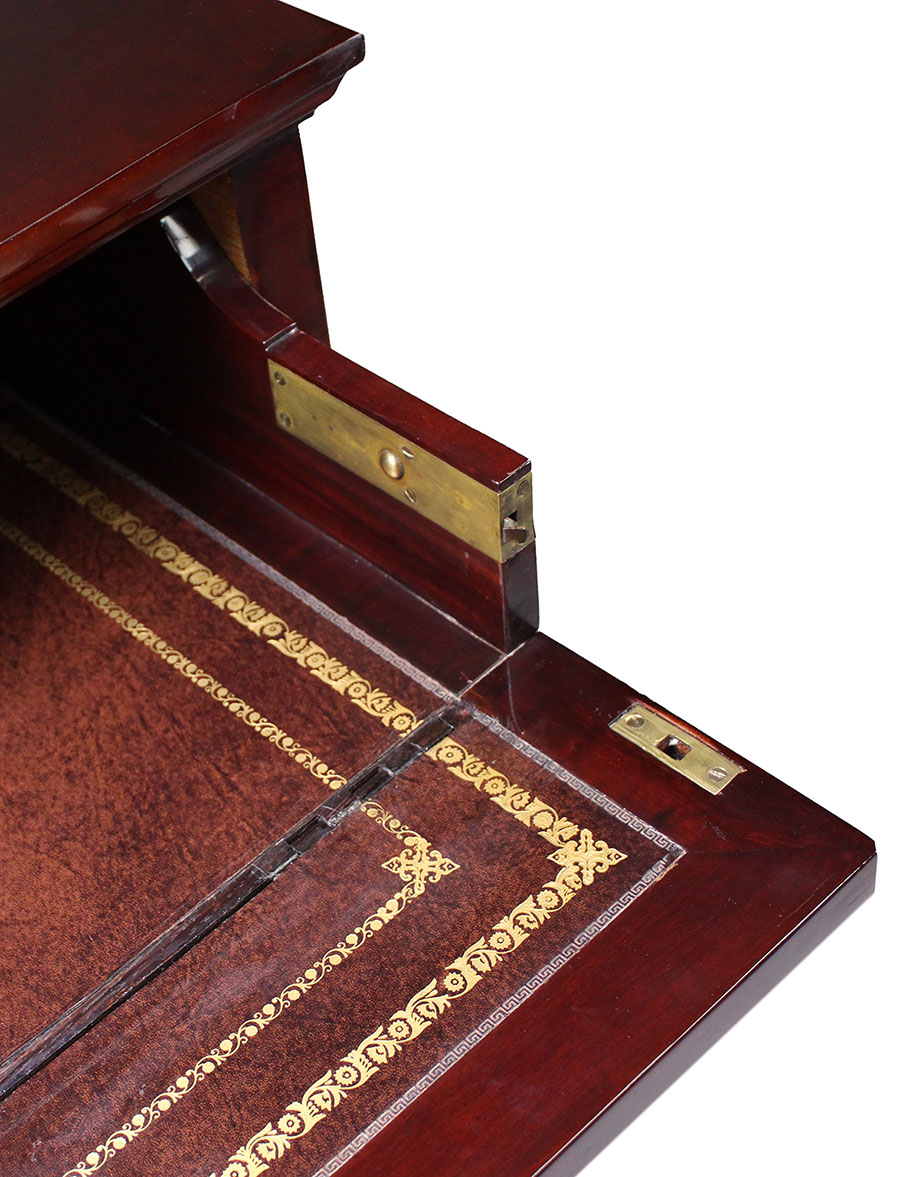 A Fine and Rare French Napoleon III Empire Style Mahogany and Gilt-Bronze Mounted Knee-Hole Secretaire with a Pull-Drawer Desk and Three Upper-Drawers with Two-Side Door Compartments, the body surmounted with gilt-bronze decorations allegorical to the First Empire. Note: Stamped JACOB on the carcass underneath. Circa: 1870.
