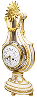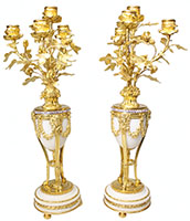 A Very Fine French Late 19th Century Louis XVI Style White Marble and Ormolu 'Lyre' Clock Garniture Set. The lyre-shaped white marble clock is mounted with finely chased ormolu throughout, featuring a circular white dial with Arabic numerals decorated with floral wreaths, set within a sparkling bejewelled border attached to the pendulum. The case is richly adorned with floral wreaths, swags and draped garlands, and surmounted by a large gilt sunburst centered with an allegorical female Bacchante mask. The open lyre reveals the (pendulum) strings above the dial. The clock is raised on a shaped oval white marble plinth with elaborate ormolu foliate, beaded and wreath mounts, standing on toupie feet. The matching pair of four-light candelabra each have an urn-shaped white marble body mounted with finely chased ormolu, decorated with satyr masks flanked by floral wreaths and hanging swags. Rising from the urn is an elaborate foliate branch structure terminating in four rose-bud shaped candle holders, each with a bejewelled rim. The candelabra are raised on circular white marble socles with ormolu borders, resting on toupie feet. The inside of the clock rim stamped "L.F. 6913" - Refers to Lerolle Frères (active c. 1836–1880s) the renowned Parisian bronze foundry and maker of luxury decorative arts, particularly known for high-quality gilded bronze clocks, candelabra, and garnitures. Founded by sons of Louis Lerolle, Édouard-François and Camille, they exhibited at major exhibitions, including the 1867 World's Fair. Circa: Paris, 1880-1890.