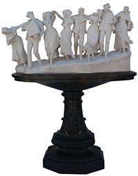 A Very Fine and Charming Italian Late 19th to early 20th-Century Carrara Marble Sculpture Group Titled “The Village Celebration” by Professor Antonio Garella (Italian, 1863-1919). The intricately, impressive and exceptionally carved statuary marble group depicting a dancing and singing group of Italian villagers, dancing and singing in a lively embrace, holding hands and arms. The joyful scene includes a figure playing an accordion, another holding a wicker basket, and a hunter with a rifle slung over his back, accompanied by his hunting dog. The sculpture is elegantly mounted on a swiveling, carved green marble pedestal. Signed: Profre A. Garella – Galleria P. Bazzanti, Firenze. Circa: Florence, 1900. Ref.: A2874 |