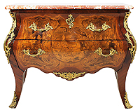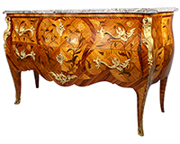 A Very Fine French 19th Century Louis XV Style Burr Walnut, Kingwood and Satinwood Floral Marquetry and Finely Chased Ormolu Mounted Bombe Commode Attributed to François Linke (1855-1946) with two drawers, with a Brêche d'Alep Marble Top. The back with a stencil print of a Parisian retailer. Circa: Paris, 1890-1900. Ref.: A2111 - Lot 10067 |