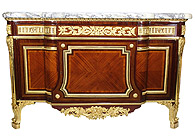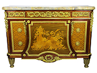 A Fine French Louis XVI Style Mahogany and Gilt-Bronze Mounted Two-Door and Two-Drawer Server Commode with a Brêche Violette Marble Top, attributed to François Linke (1855-1946). The twin front doors, concealing a single shelf interior, each centered with an applied spray of flowers and hummingbirds within an acanthus trim, the apron pair of drawers with ormolu mounts depicting a whismical and playful pair of baby bacchus carrying a putto on a bed of vines, grapes and leaves, each flanked by a pair of heptagon ormolu handles. The sides with similar apron mounts above a large ormolu bouquet of flowers, all raised on four fluted and ormolu mounted legs. Unsigned. Circa: Paris, 1920-1930. Ref.: A1573 |