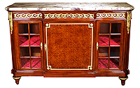 A Very Fine French 19th-20th Century Louis XVI Style Mahogany, Tulipwood and Ormolu-Mounted Parquetry Three-Door Vitrine Commode 'Meuble d'appui' with a Brêche Violette Marble Top, attributed to François Linke (1855-1946). The interior of the vitrine with three glass shelves, lined with a burgundy broque fabric and a mirror backing, flanked by a pair of side doors, each fitted with a pair of mahogany shelves. Stamped 'FL' twice on the carcass. The lock-plate stamped "C. Keller 22 R. Des Taillandiers". One key. Circa: Paris, 1900. Ref.: A1891 - Lot 10134 |